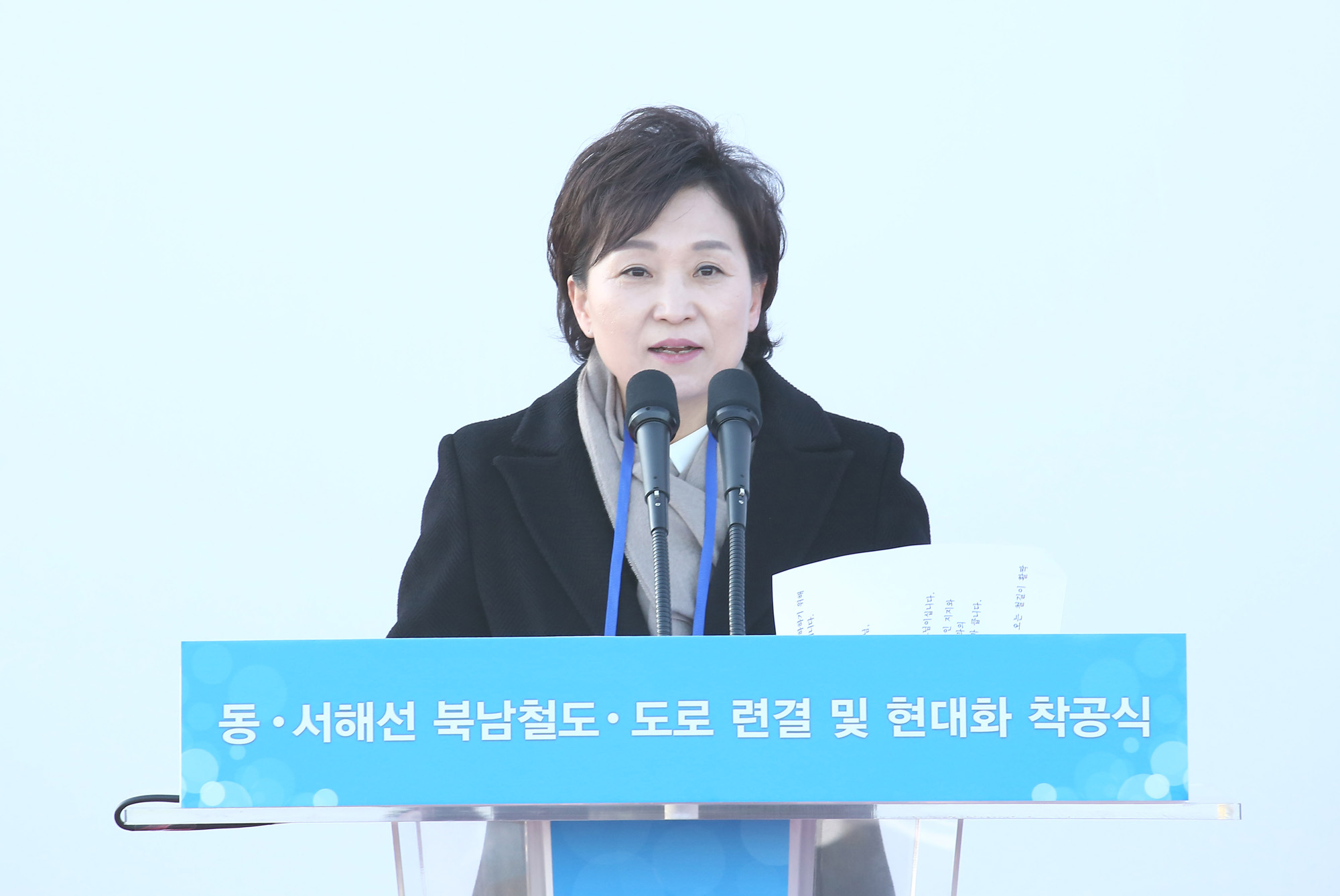 26일 북측 개성 판문역에서 남북 철도·도로 연결 및 현대화 착공식에서 김현미 국토교통부 장관이 착공사를 하고 있다. 2018.12.26 사진/임준선기자