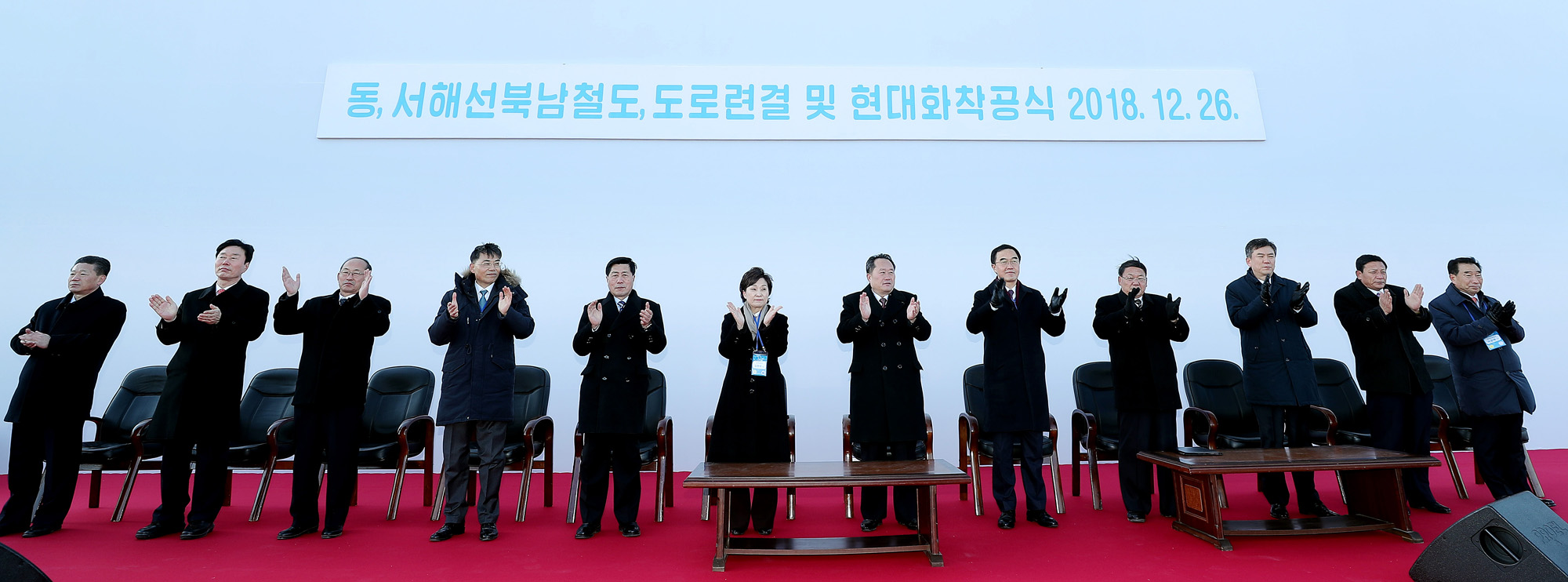 | 사진설명 | 김현미 국토교통부 장관(왼쪽 여섯번째), 조명균 통일부 장관(오른쪽 다섯번째), 북측 리선권 조국평화통일위원회 위원장(오른쪽 여섯번째)을 비롯한 내빈들이 26일 오전 개성 판문역에서 진행된 '동·서해선 남북 철도·도로 연결 및 현대화 착공식'을 마친 뒤 박수를 치고 있다. 2018.12.26 사진/임준선기자 |