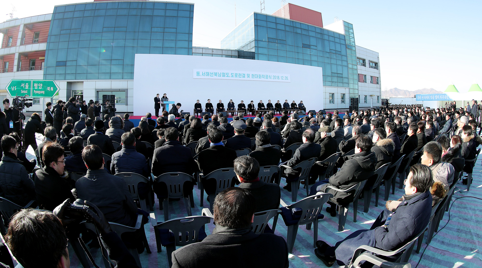 '동·서해선 남북 철도·도로 연결 및 현대화 착공식'이 26일 오전 개성 판문역에서 김현미 국토교통부 장관, 조명균 통일부 장관, 북측 리선권 조국평화통일위원회 위원장 등이 참석한 가운데 진행되고 있다. 2018.12.26 사진/임준선기자