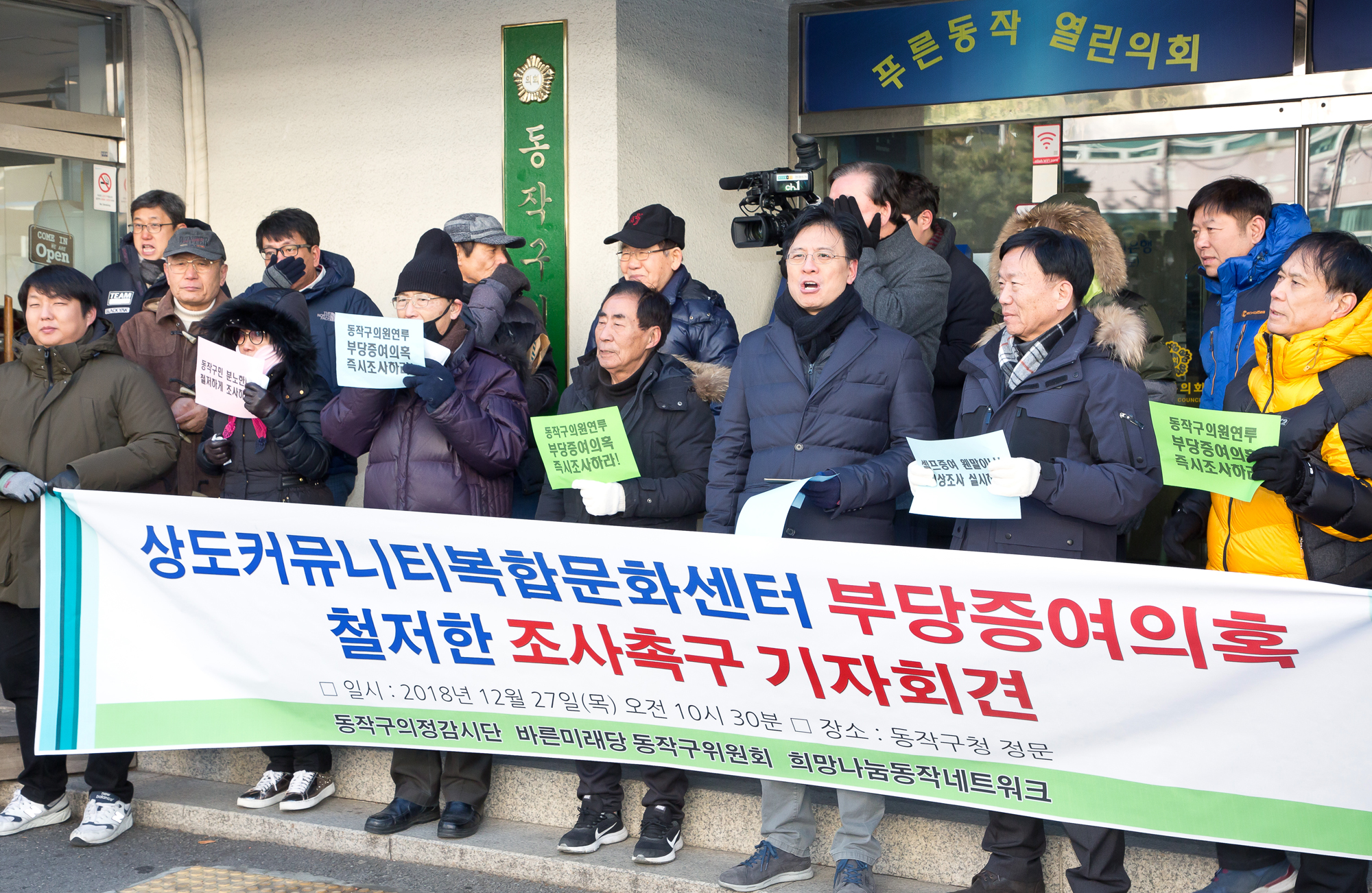 [서울=eoimage] 임준선 기자 = 27일 오전 동작구 의회 앞에서 희망나눔동작네트워크가 상도커뮤니티 복합 문화센터 부당증여의혹을 철저한 조사를 촉구 하는 기자회견을 하고 있다. 2018.12.27