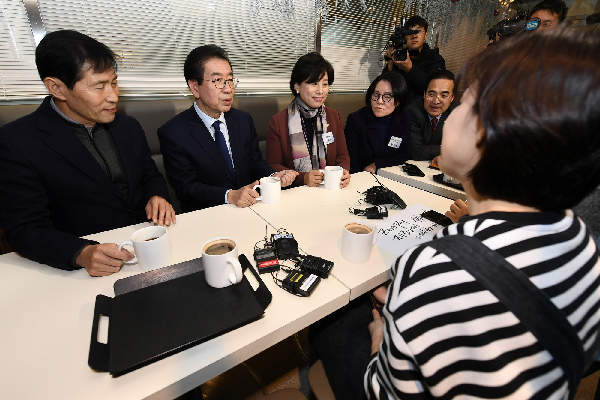 자영업자 결제수수료가 없는 제로페이 시범 서비스 첫날인 20일 박원순(오른쪽) 서울시장이 중구의 한 카페에서 직접 결제를 시연하고 있다. 서울시 제공