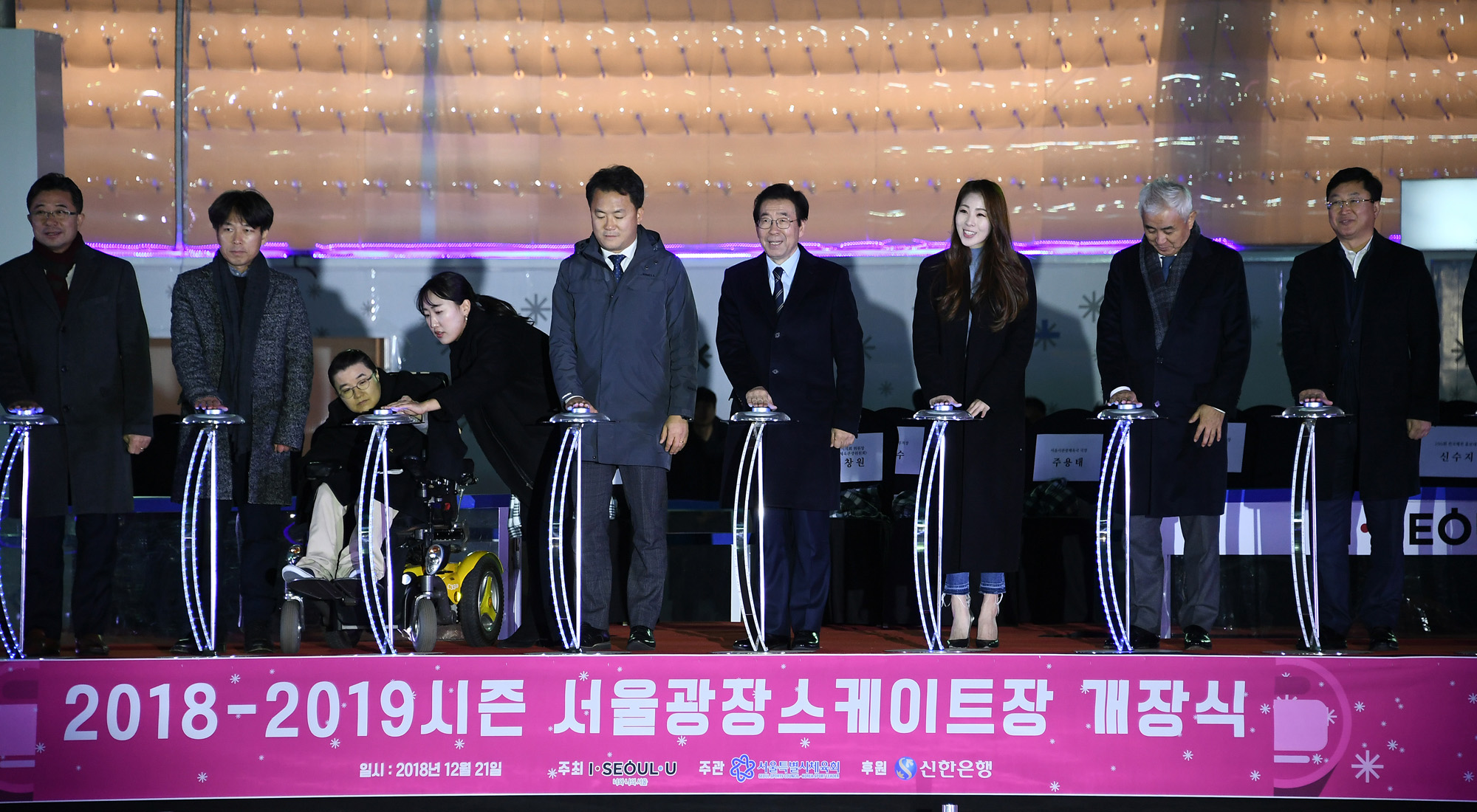 21일 서울광장 스케이트장에서 박원순 서울시장이 개장 기념 인사말을 하고 있다. 이날 개장한 스케이트장은 내년 2월 10일까지 운영된다. 서울시 제공
