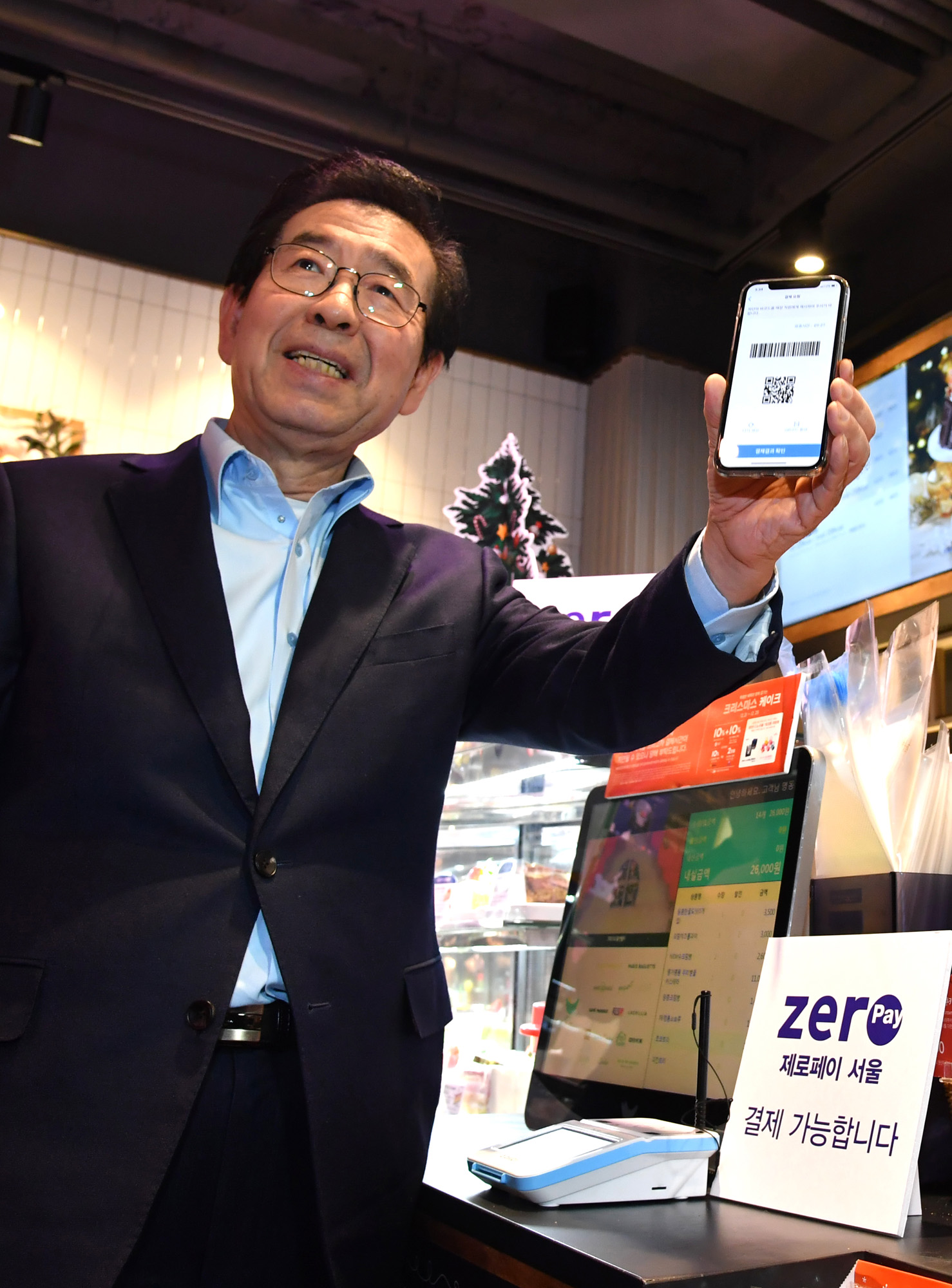 박원순 서울 시장이 24일 서울 중구 파리바게뜨 명동 본점에서 제로페이 QR코드로 결제하고 있다. 서울시 제공