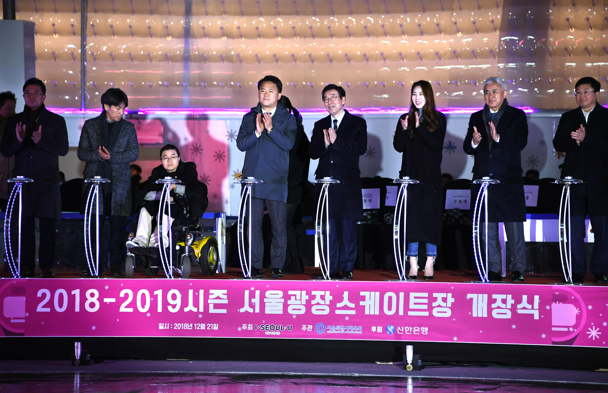 21일 서울광장 스케이트장에서 박원순 서울시장이 개장 기념 인사말을 하고 있다. 이날 개장한 스케이트장은 내년 2월 10일까지 운영된다. 서울시 제공
