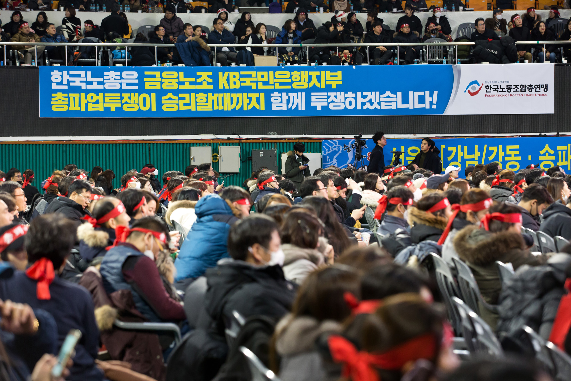 [eoimage=서울] 임준선 기자 =총파업에 돌입한 전국금융산업노조 KB국민은행 지부 조합원들이 8일 오전 서울 송파구 학생체육관에서 총파업 투쟁을 하고 있다. 2019.01.08 eomaster@eoimage.com