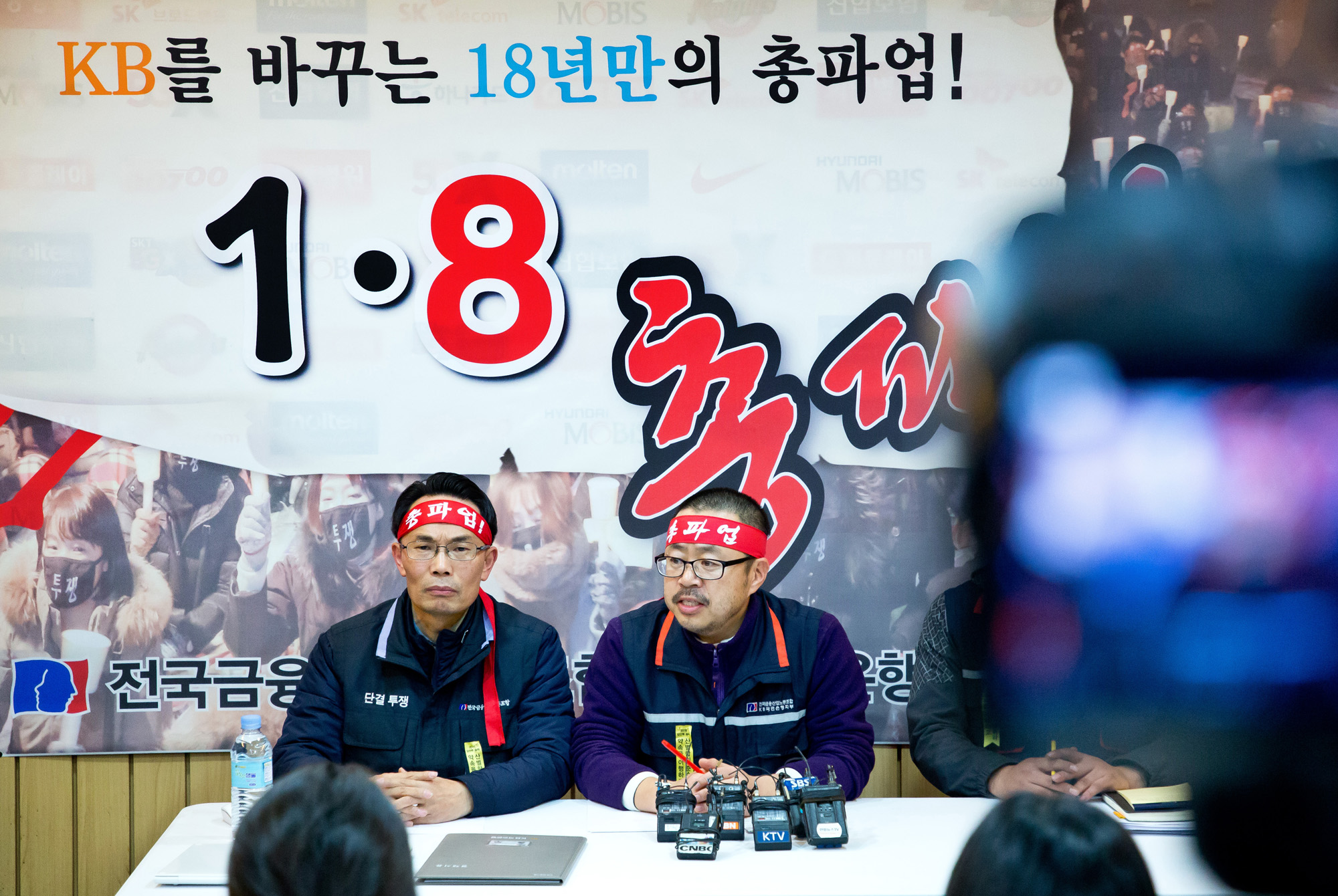 | 사진설명 | [eoimage=서울] 임준선 기자 =박홍배 전국금융산업노조 KB국민은행지부 위원장이 8일 오후 서울 송파구 잠실학생체육관에서 열린 KB국민은행 총파업에서 기자회견을 하고 있다. 국민은행 노조의 총파업은 2000년 주택은행과 국민은행 합병 반대 파업 이후 19년 만이다. 2019.01.08 eomaster@eoimage.com |