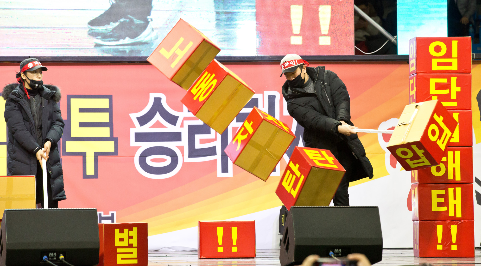 [eoimage=서울] 임준선 기자 =총파업에 돌입한 전국금융산업노조 KB국민은행 지부 조합원들이 8일 오전 서울 송파구 학생체육관에서 총파업 투쟁 퍼포먼스를 하고 있다. 2019.01.08 eomaster@eoimage.com