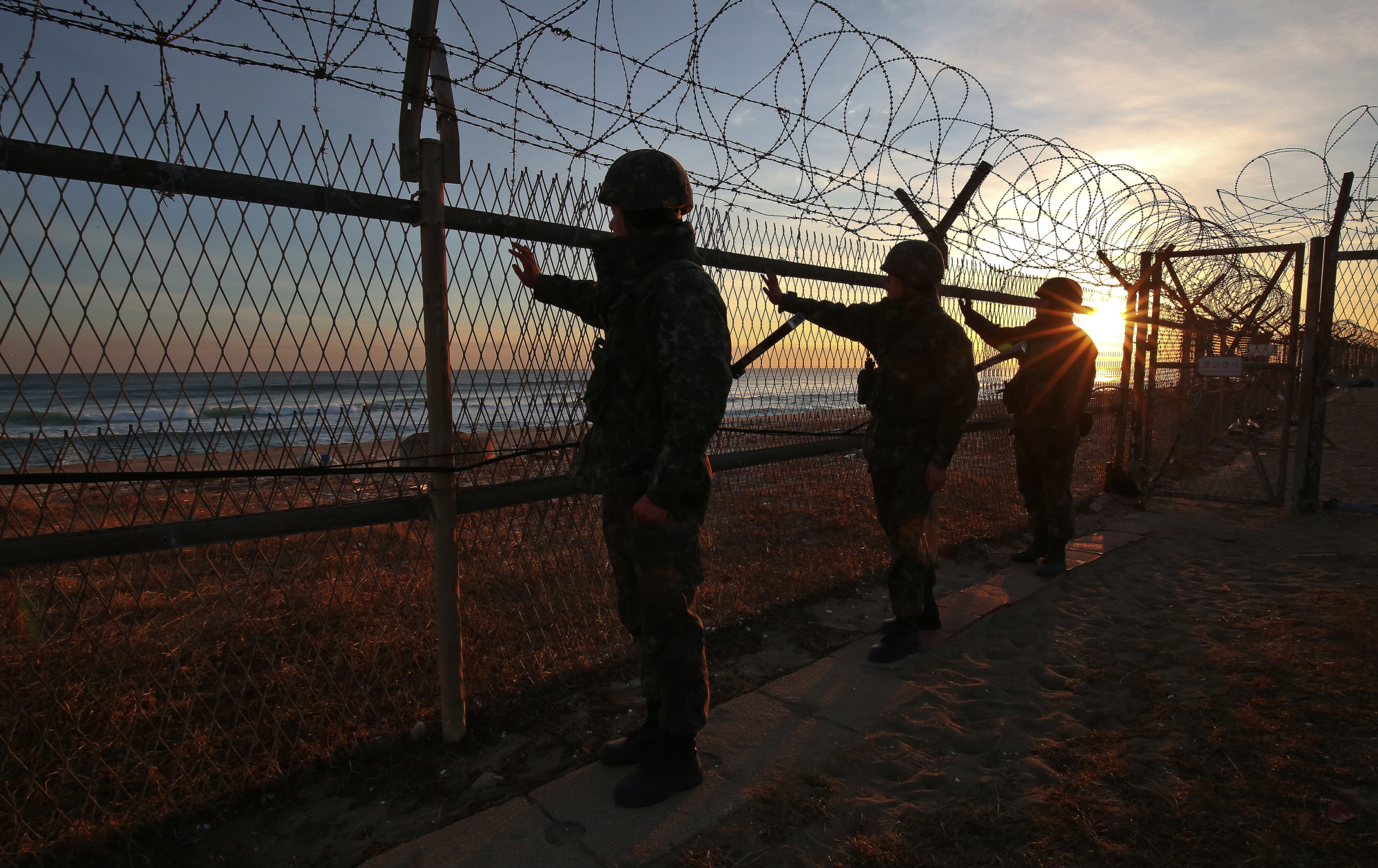 [고성=eoimage] 고성준 기자 = 9일 오전 강원도 고성군 해안철책 인근에서 국군 장병들이 경계근무 교대 이동 중 철책 점검을 하고있다. 2019.1.9