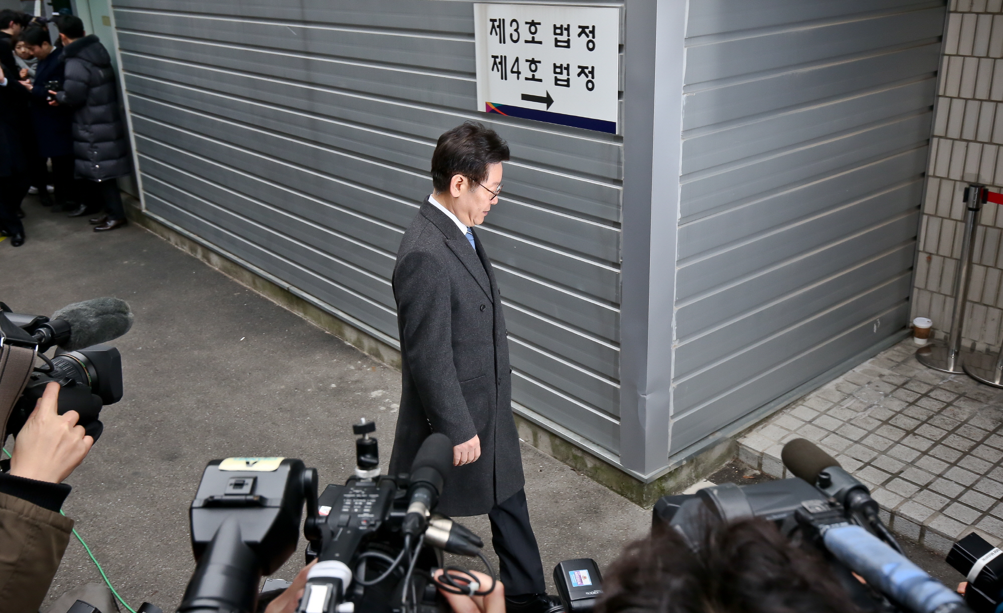 [성남=eoimage] 고성준 기자 = 공직선거법 위반 등 혐의로 기소된 이재명 경기지사가 10일 오후 경기도 성남시 수원지방법원 성남지원에서 열린 첫 공판에 출석하고 있다. 2019.1.10