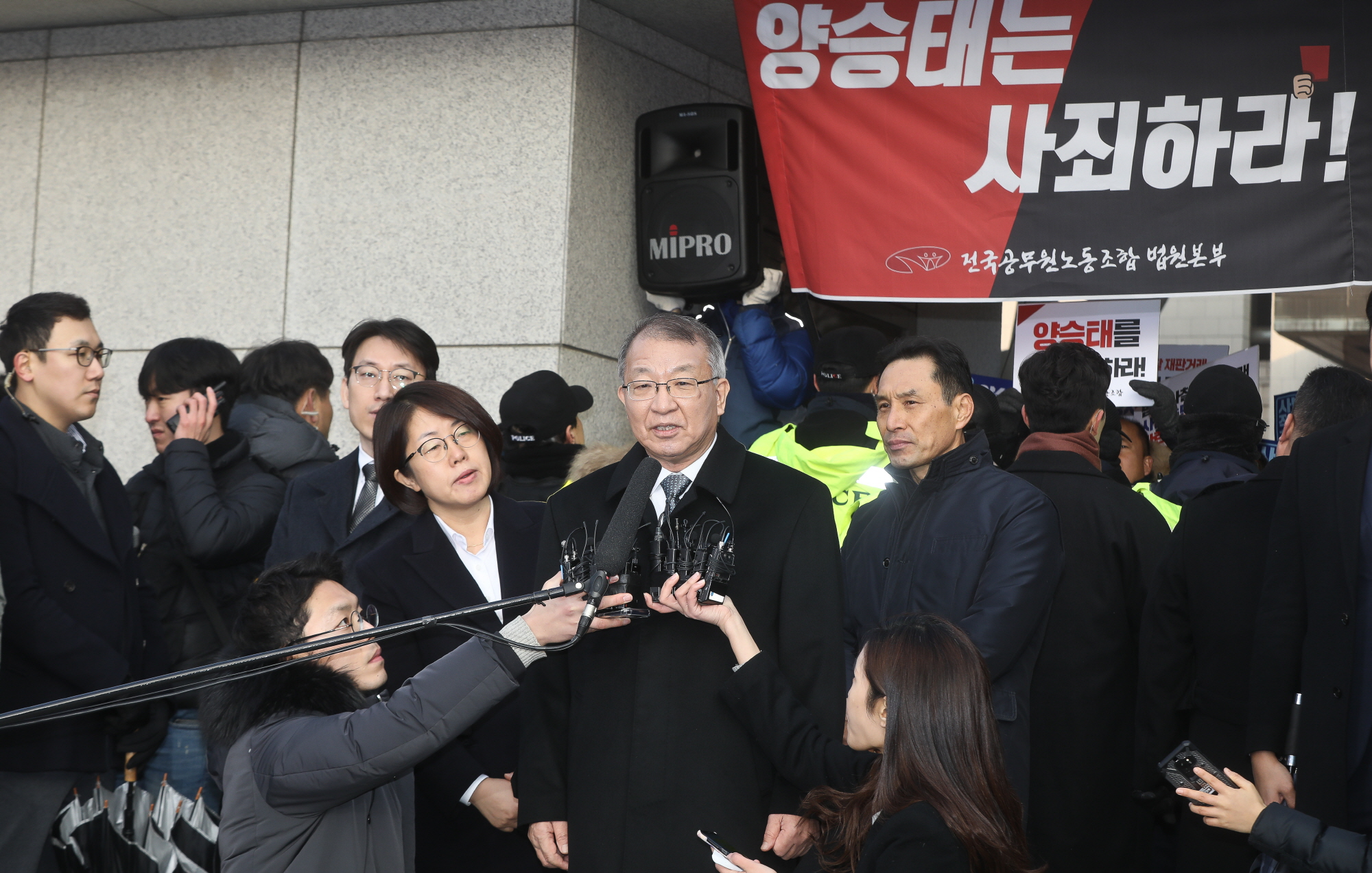[서울=eoimage] 고성준 기자 = 사법농단 의혹의 정점으로 지목된 양승태 전 대법원장이 11일 오전 서울 서초구 대법원 정문 앞에서 입장발표 기자회견을 하고있다. 2019.1.11