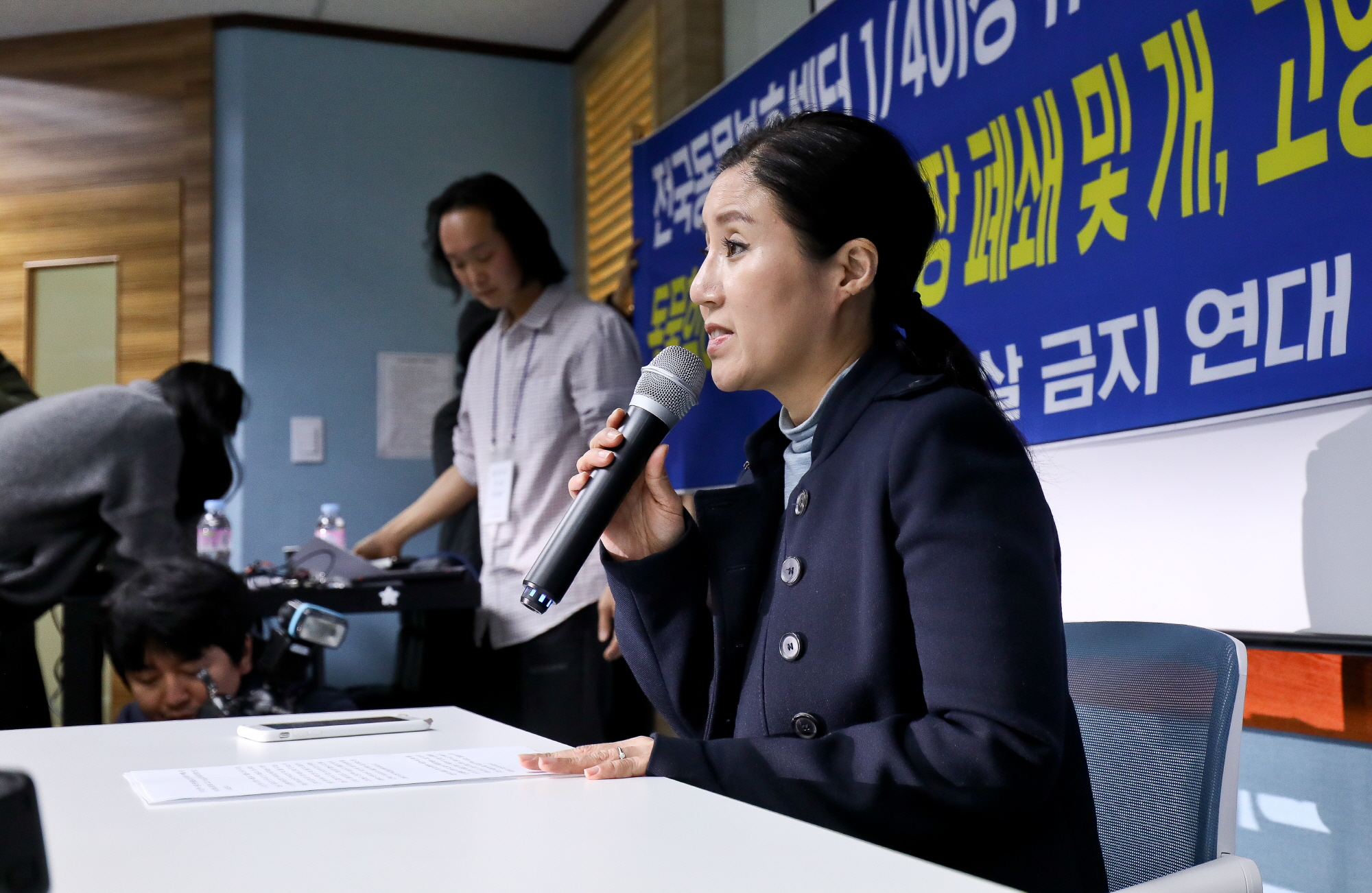 [서울=eoimage] 고성준 기자 = 19일 오전 서울 서초구에 위치한 빌딩에서 케어 박소연 대표가 기자회견에 참석하고 있다. 2019.1.19
