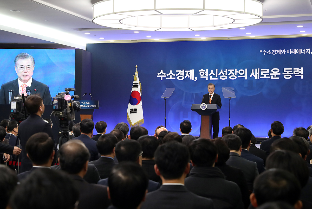 문재인 대통령이 17일 울산 남구 울산시청에서 열린 전국경제투어 '수소경제와 미래에너지, 울산에서 시작됩니다' 수소경제 전략보고회에서 인사말하고 있다.