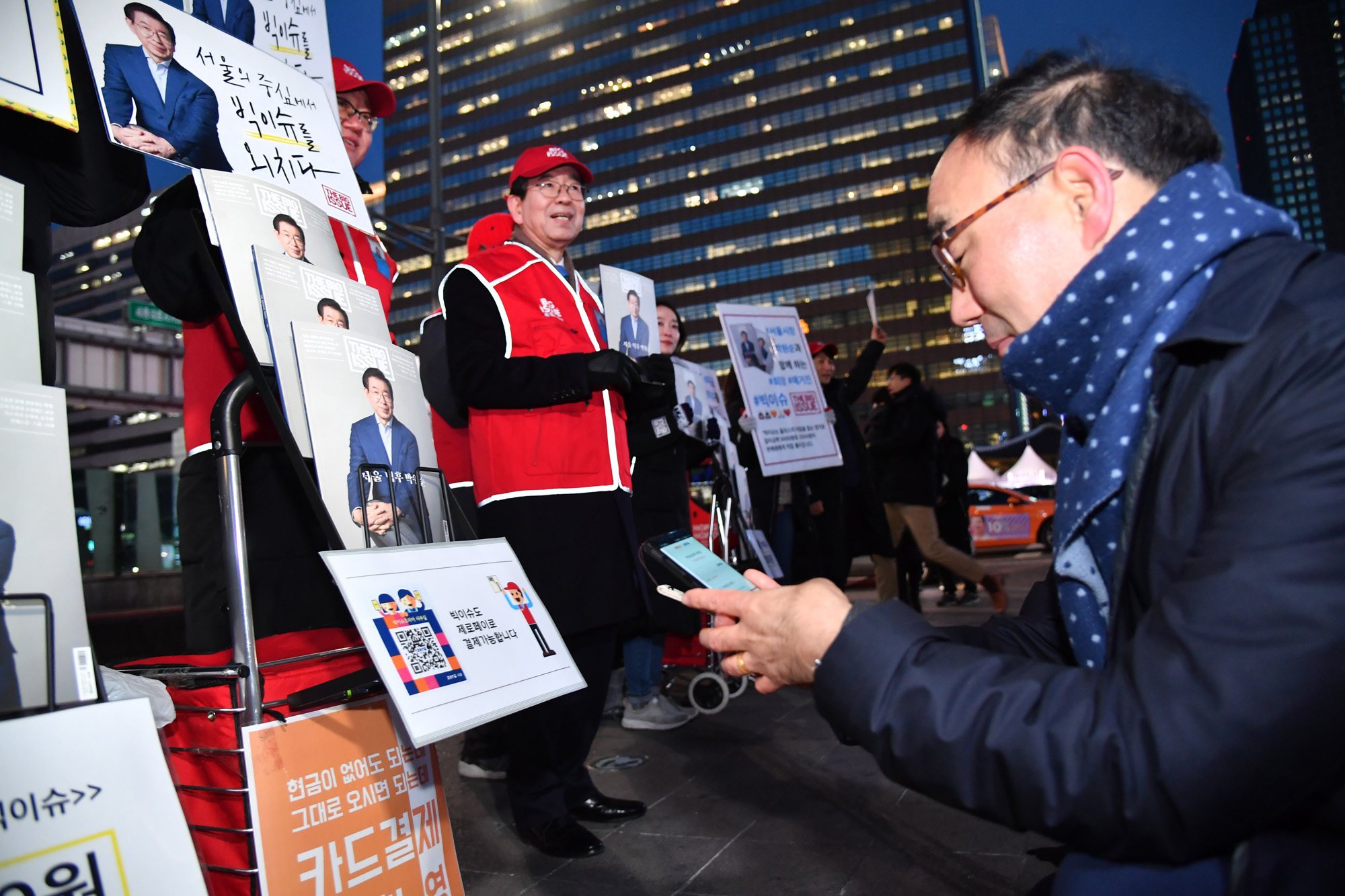 빅이슈 판매 도우미로 나선 박원순 서울시장이 8일 오후 서울 광화문역 7번 출구 앞에서 빅이슈 판매원들과 함께 시민들에게 구입을 요청하고 있다. 서울시 제공
