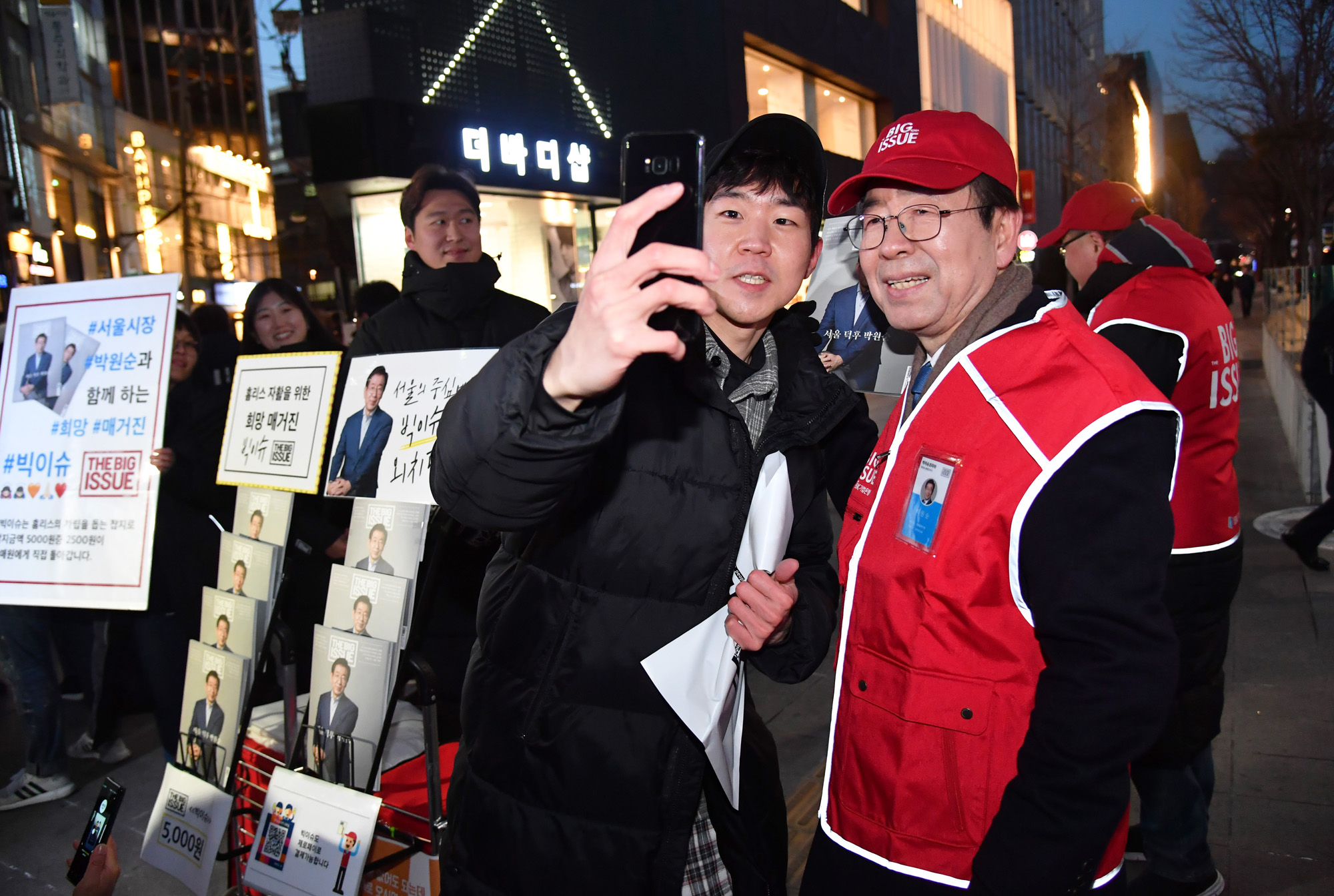 빅이슈 판매 도우미로 나선 박원순 서울시장이 8일 오후 서울 광화문역 7번 출구 앞에서 빅이슈 판매원들과 함께 시민들에게 구입을 요청하고 있다. 서울시 제공
