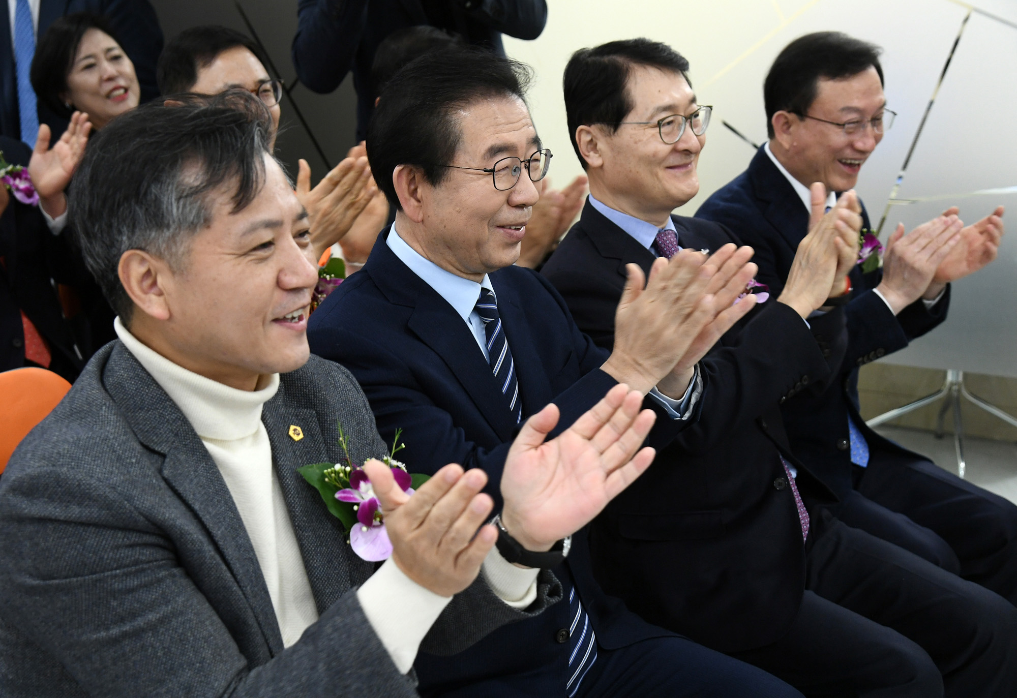 9일 오전 서울시청에서 열린 서울시청금융센터 개점식에서 박원순 서울시장이 신한은행 직원들과 인사를 하고 있다. 서울시 제공