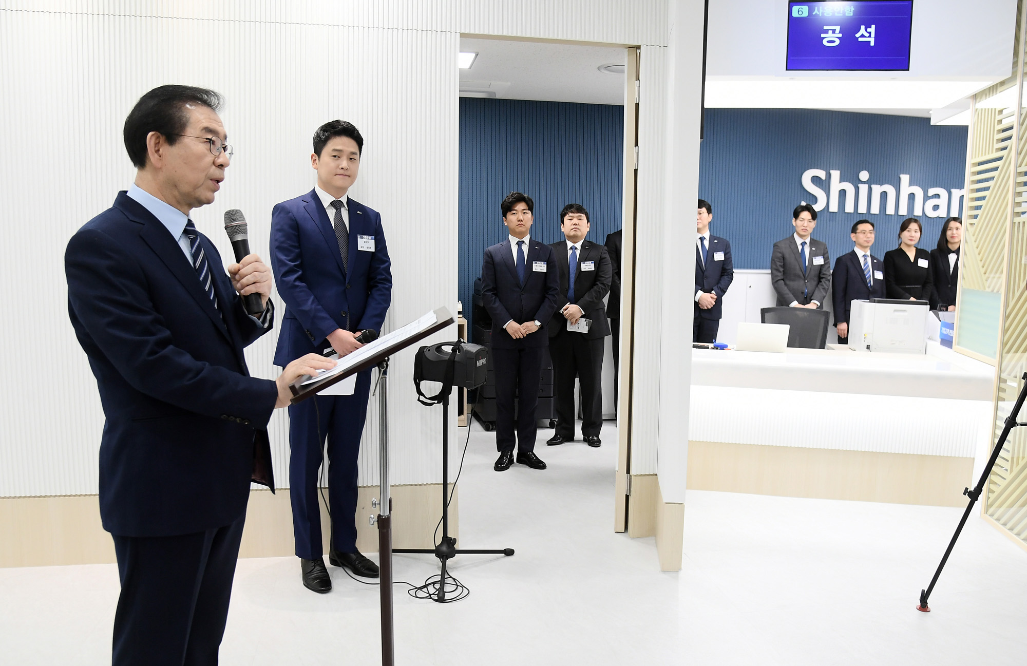 9일 오전 서울시청에서 열린 서울시청금융센터 개점식에서 박원순 서울시장이 신한은행 직원들과 인사를 하고 있다. 서울시 제공