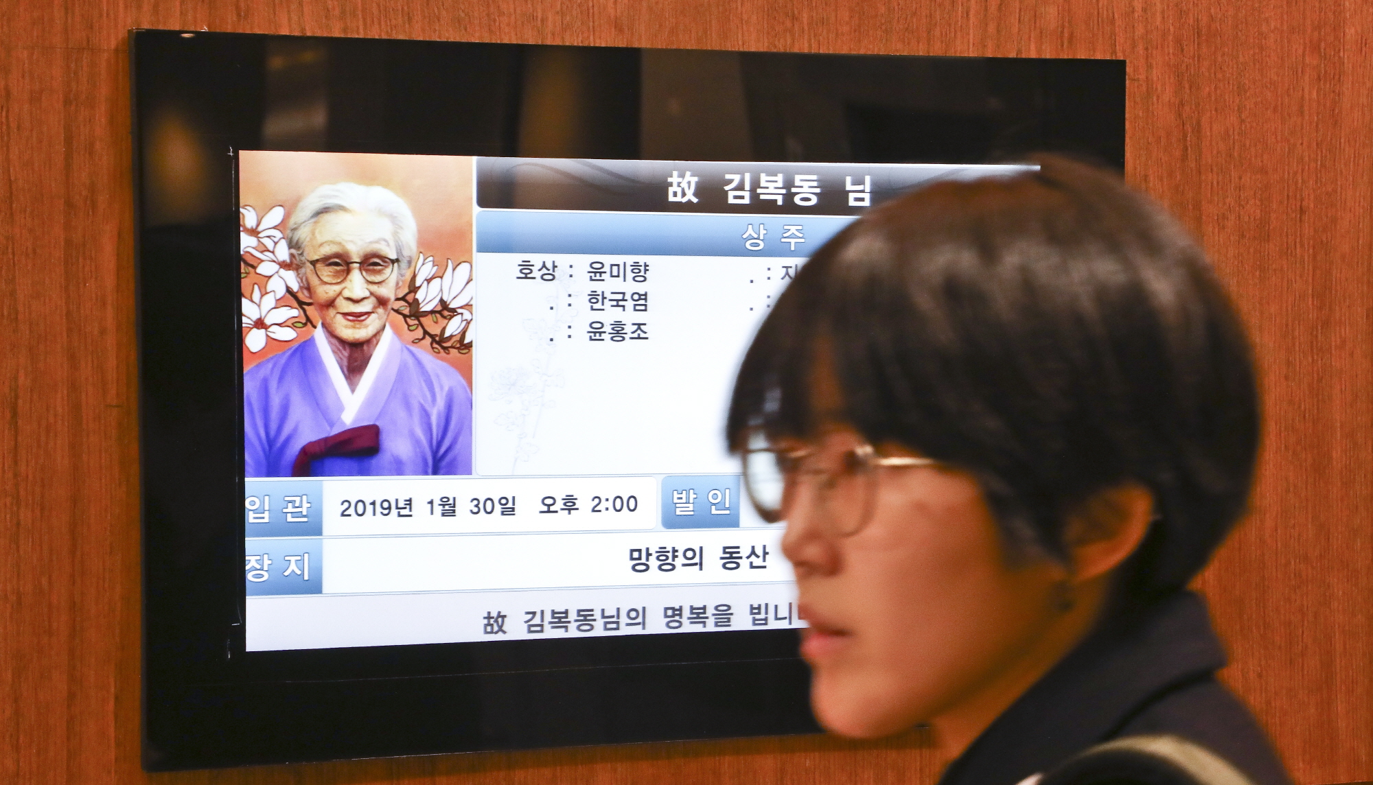[서울=eoimage] 고성준 기자 = 29일 오후 일본군 위안부 피해자 고 김복동 할머니 빈소 입구 스케치. 2019.1.29