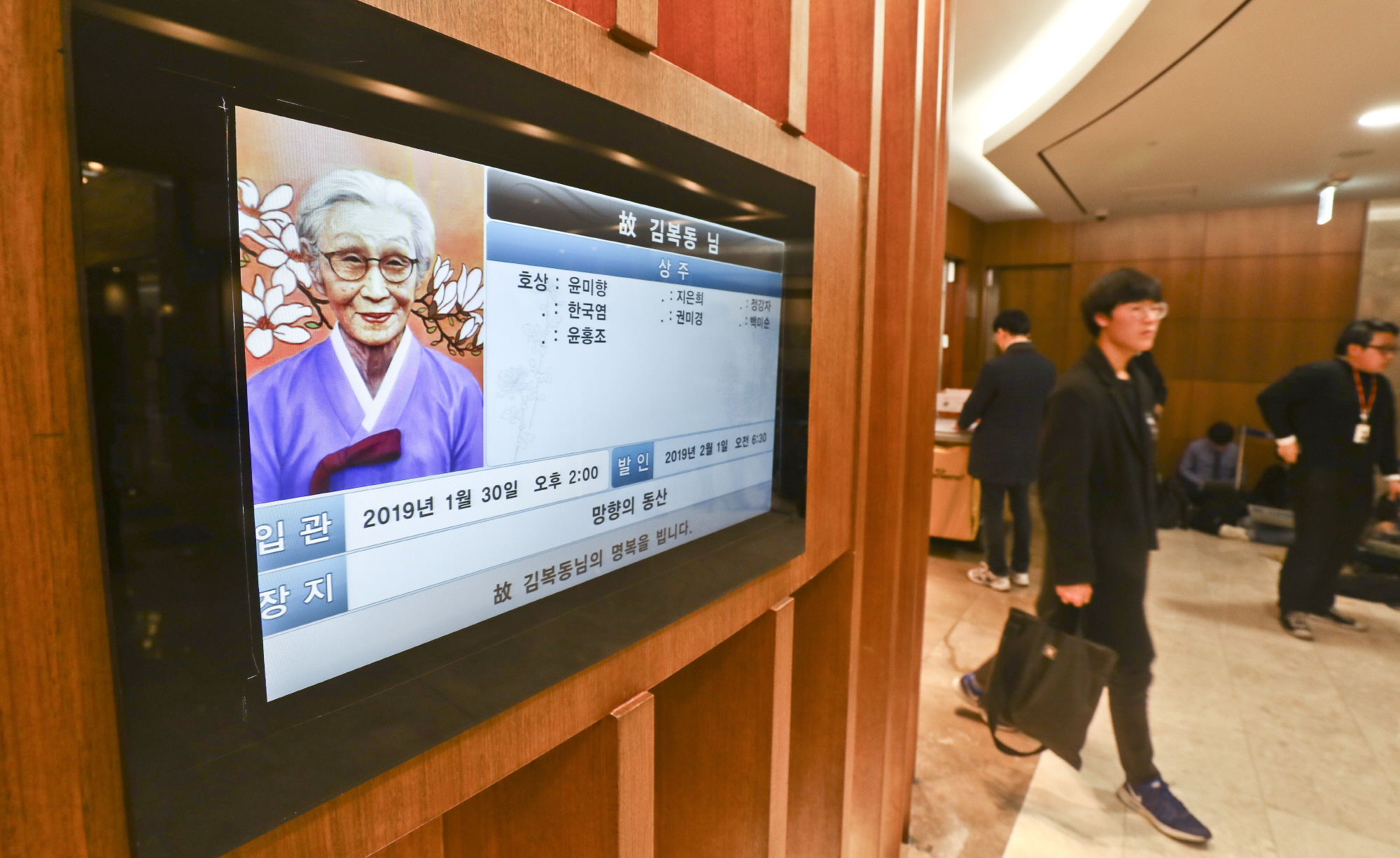 [서울=eoimage] 고성준 기자 = 29일 오후 일본군 위안부 피해자 고 김복동 할머니 빈소 입구 스케치. 2019.1.29