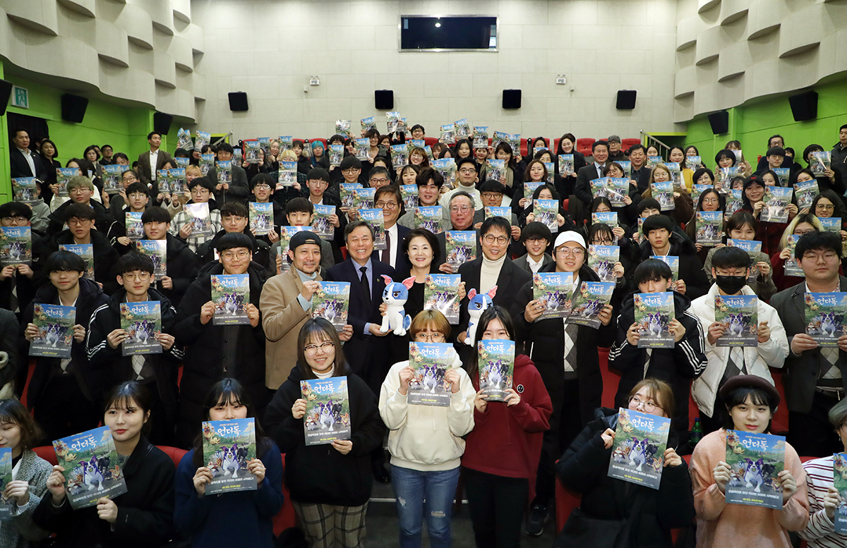 문재인 대통령 부인 김정숙 여사가 29일 오후 서울 성북구 아리랑시네센터에서 국산 애니메이션 영화 '언더독'을 관람한 뒤 참석자들과 함꼐 주인공 '뭉치'의 인형을 들고 기념 촬영을 하고 있다