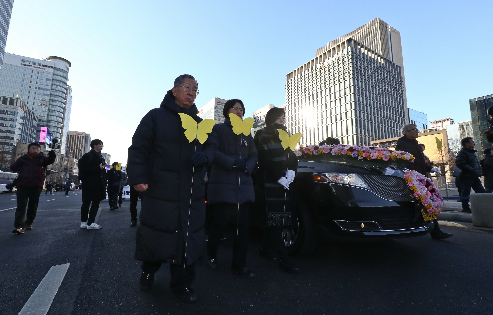[서울=eoimage] 고성준 기자 = 1일 오전 서울 시청광장 일대에서 일본군 위안부 피해자 김복동 할머니의 노제가 진행되고 있다. 2019.2.1