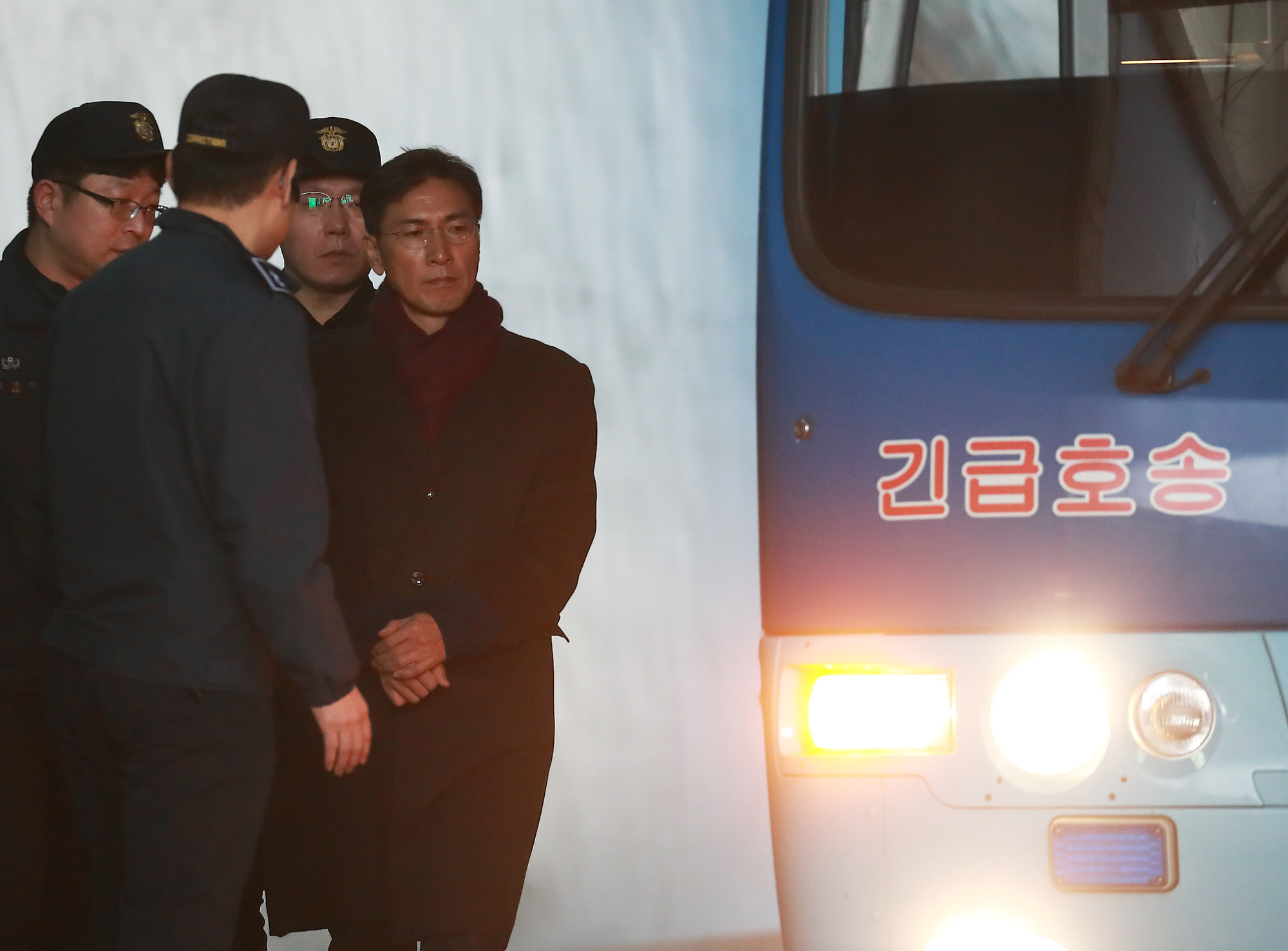 안희정 전 충남지사가 1일 서울 서초구 서울고등법원에서 열린 비서성폭행 관련 강제추행 등 항소심 선고공판에서 법정구속이 되어 호송차로 이동하고 있다. 2019.02.01 사진/임준선기자(현장풀)