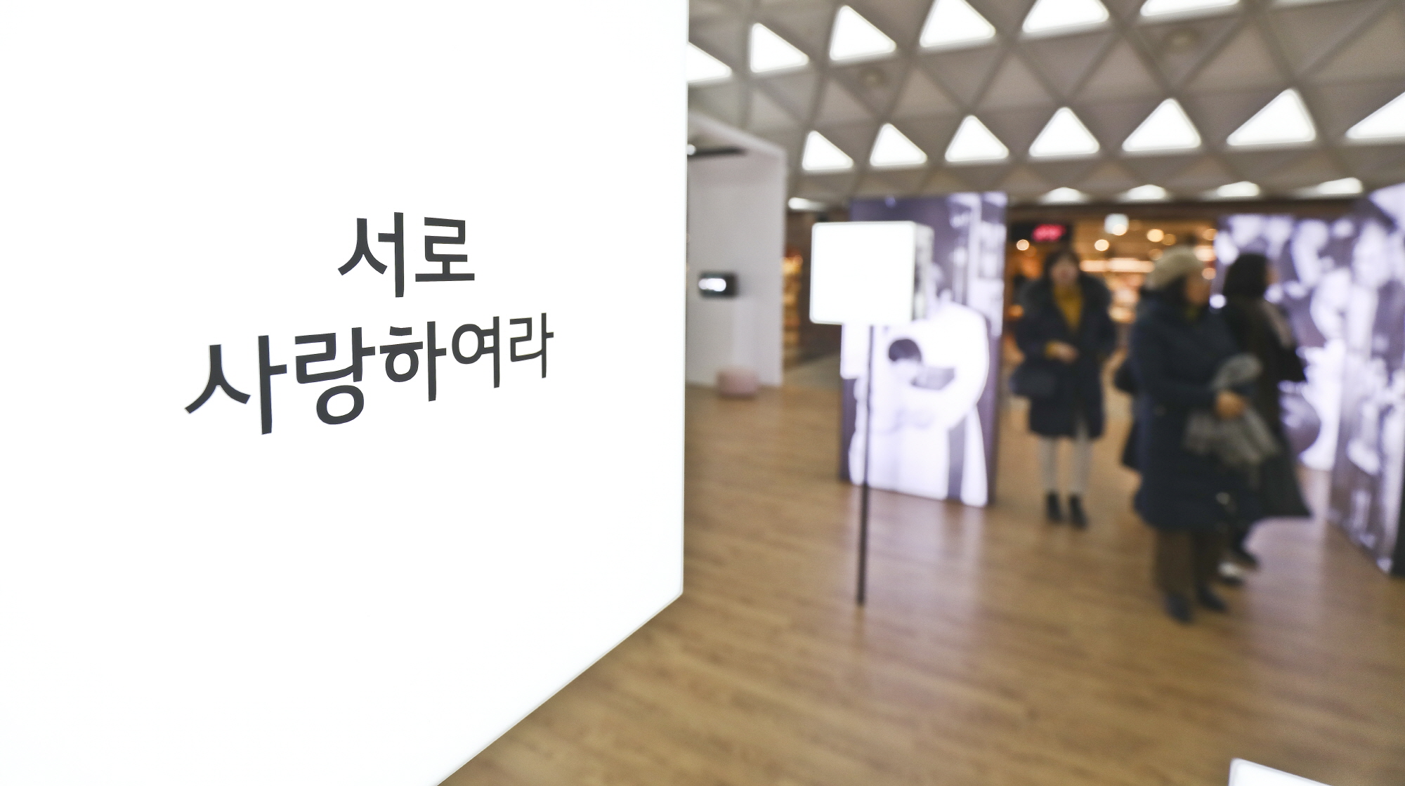 [서울=eoimage] 고성준 기자 = 14일 오전 서울 중구 명동성당 1898광장에서 열린 김수환 선종 10주기 전시회를 찾은 시민들이 전시를 관람하고 있다 2019.2.14