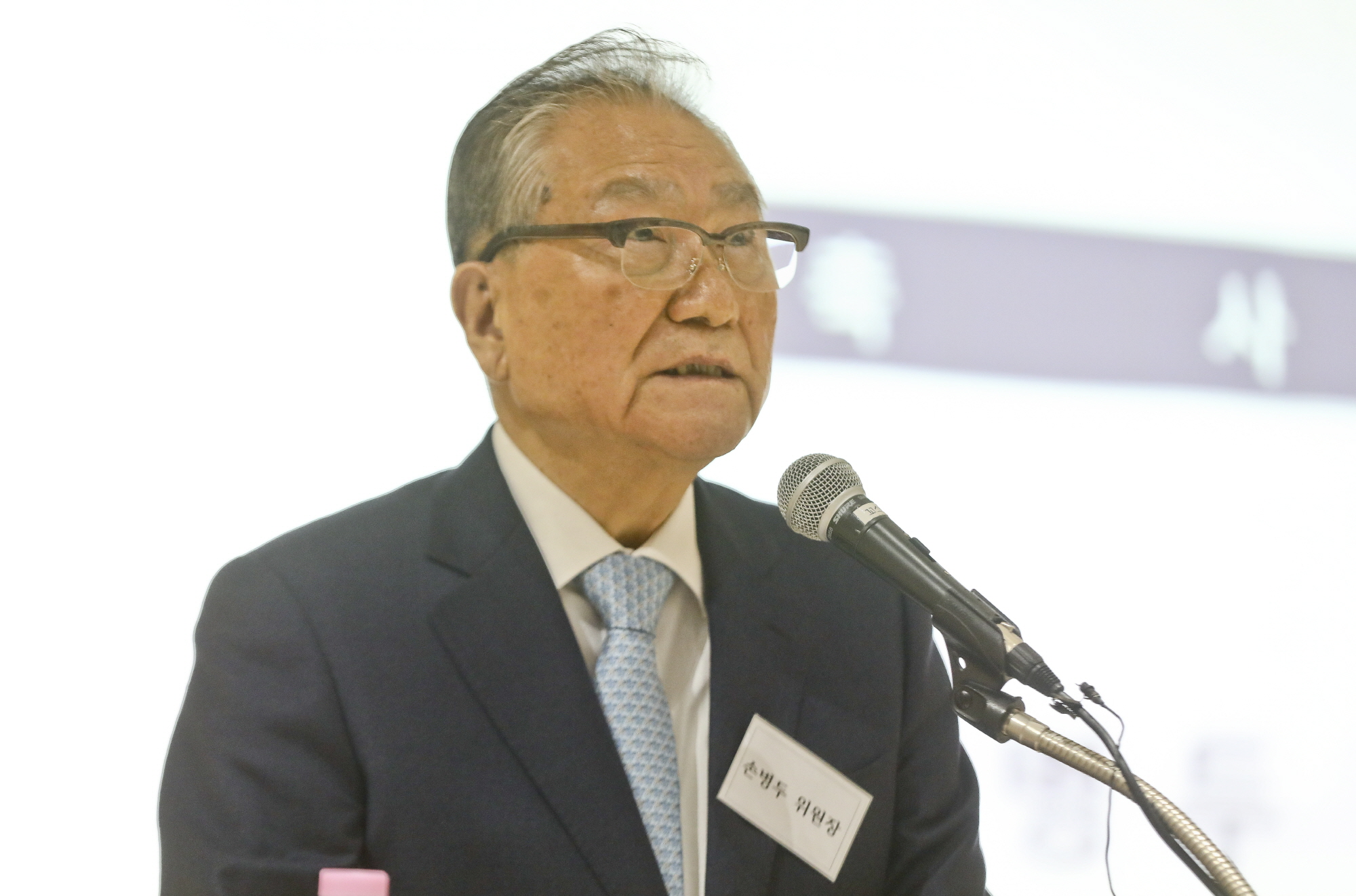 [서울=eoimage] 고성준 기자 = 14일 오후 서울 중구 명동성당에서 열린 김수환 추기경 선종 10주기 기념 심포지엄에 참석한 손병두 김수환추기경연구소 운영위원장이 축사를 하고있다. 2019.2.14