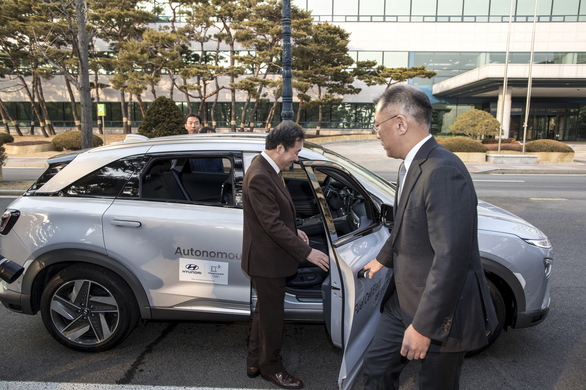 정의선(오른쪽) 현대차그룹 수석부회장이 30일 오후 경기 화성시 현대기아차 기술연구소에서 이낙연 국무총리가 탑승할 자율주행 수소전기차량의 문을 열어주고 있다.