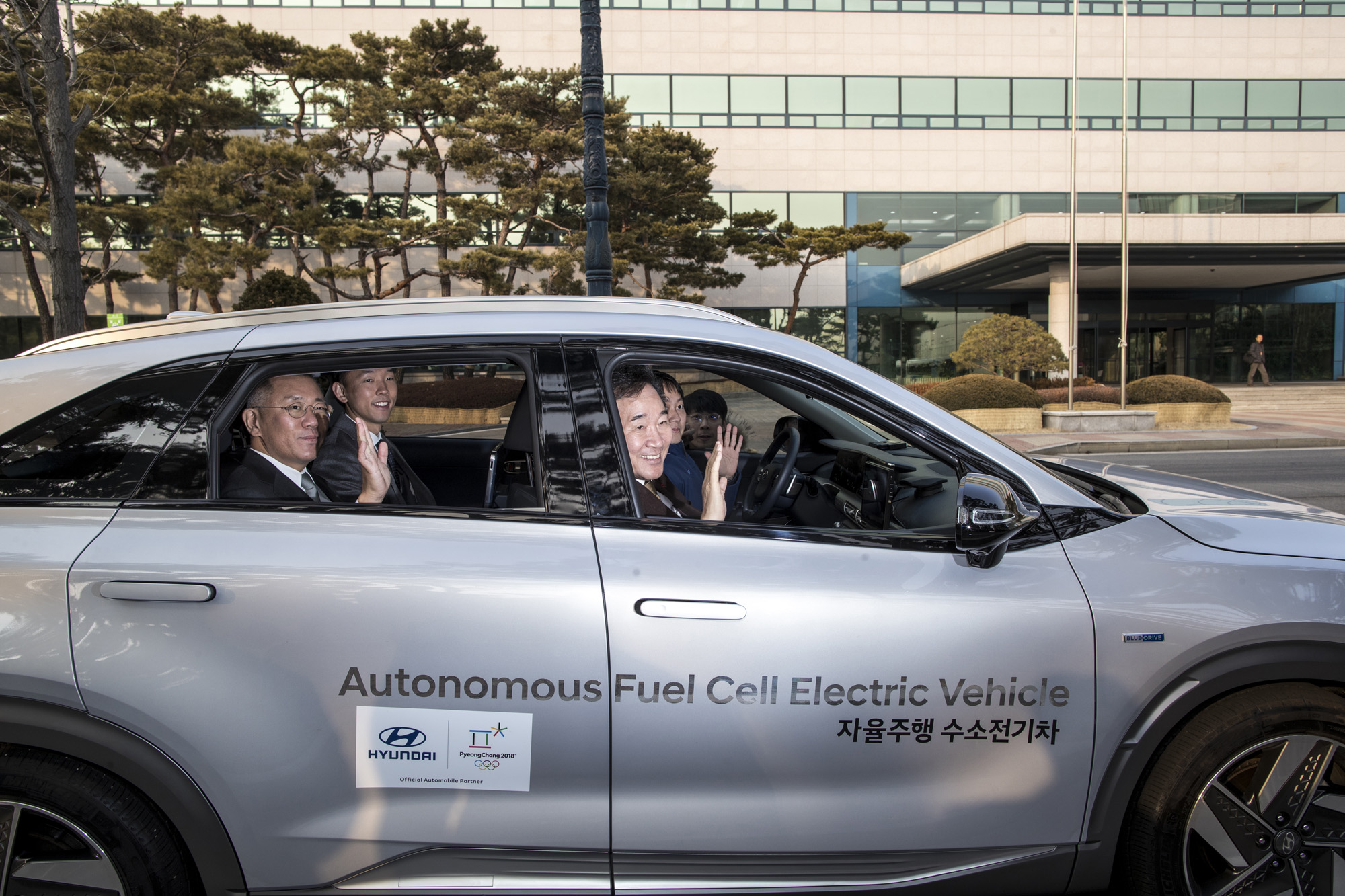 이낙연(오른쪽) 국무총리와 정의선 현대차그룹 수석부회장이 30일 오후 경기 화성시 현대기아차 기술연구소에서 자율주행 수소전기차량에 탑승해 있다.
