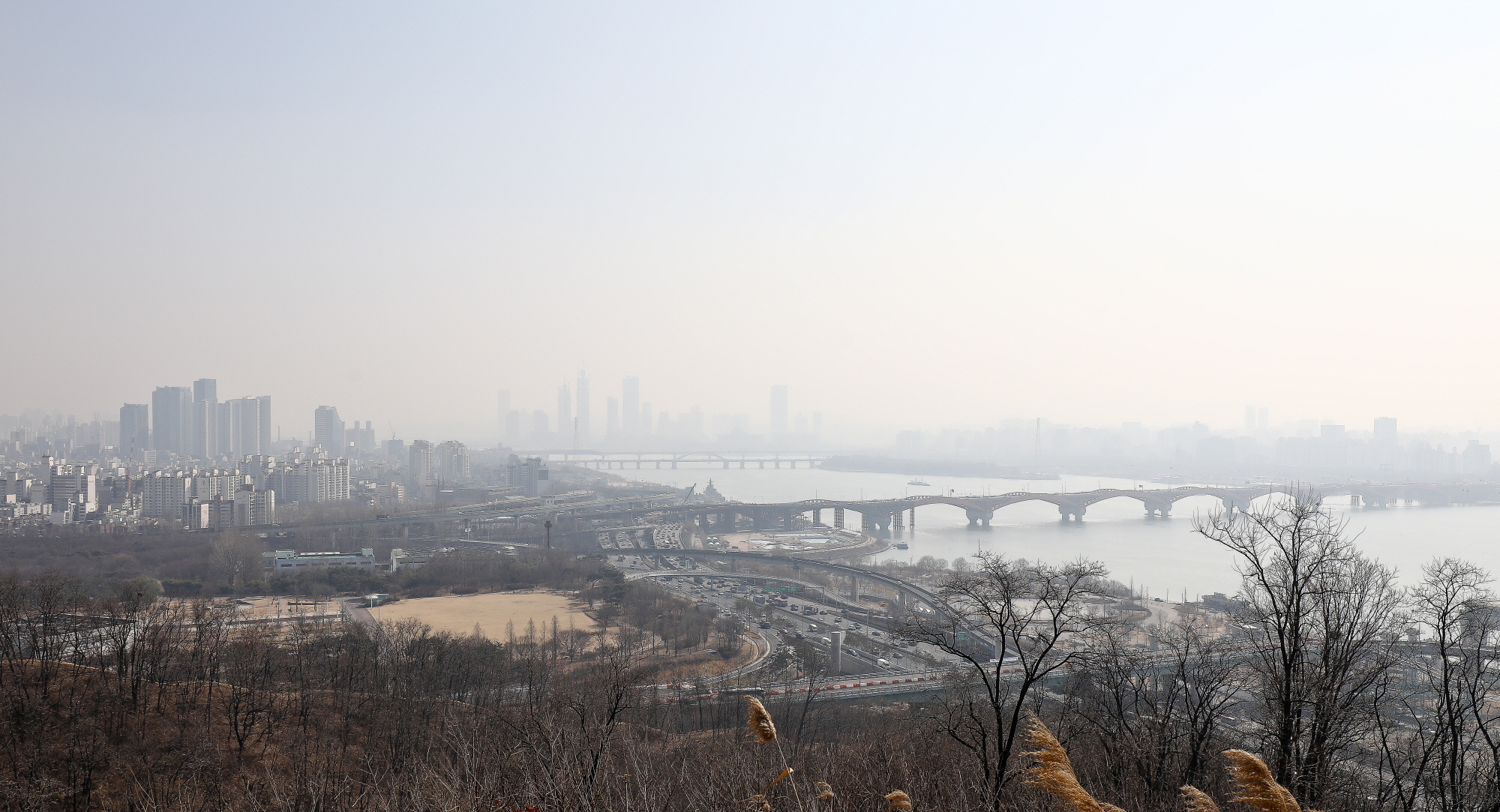 [서울=eoimage] 고성준 기자 = 미세먼지 예비저감조치가 발령된 21일 오후 서울 마포구 하늘공원에서 바라본 서울 도심이 미세먼지의 영향으로 뿌연 모습을 보이고 있다. 2019.2.21