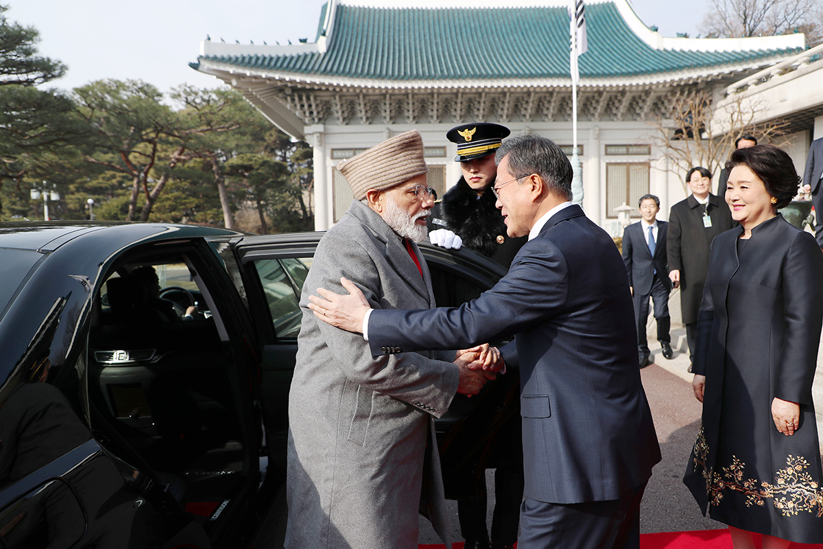 문재인 대통령과 부인 김정숙 여사가 22일 오전 청와대 대정원에서 국빈 방문 중인 나렌드라 모디 인도총리를 영접하고 있다.