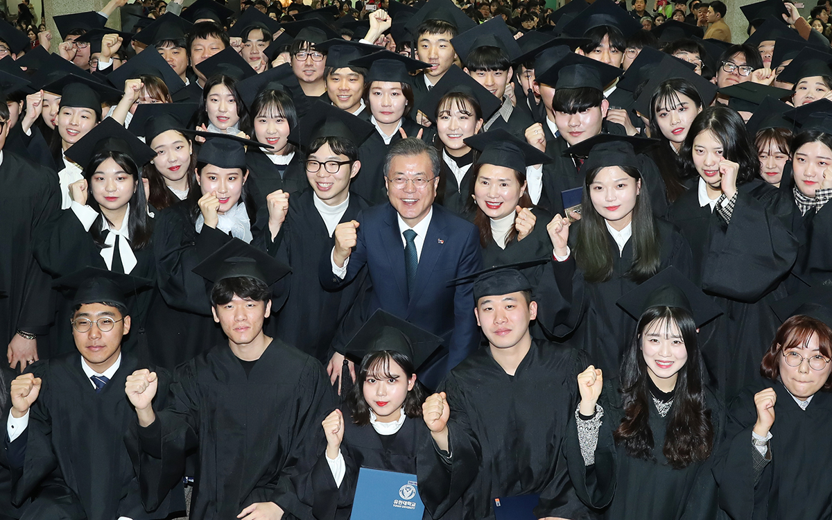 문재인 대통령이 21일 오전 경기도 부천 유한대학교에서 열린 2018학년도 학위수여식에 참석하고 있다. 2019.2.21 사진 청와대제공