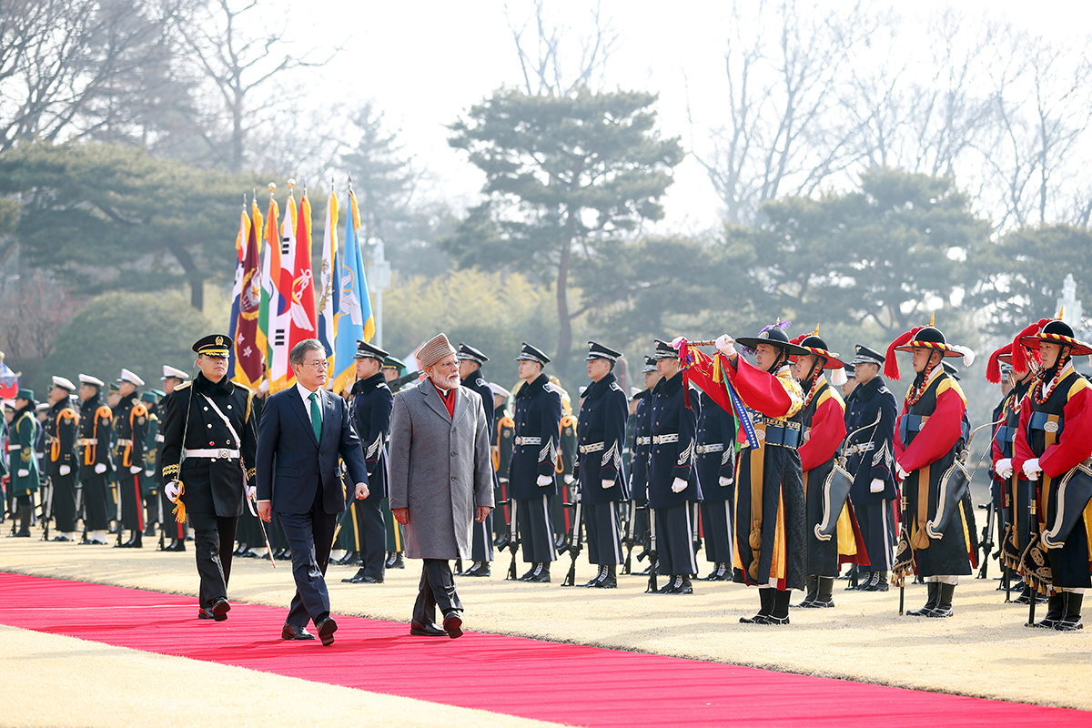 문재인 대통령과 국빈 방한중인 나렌드라 모디 인도 총리가 22일 청와대 대정원에서 열린 공식 환영식에서 의장대 사열을 하고 있다.