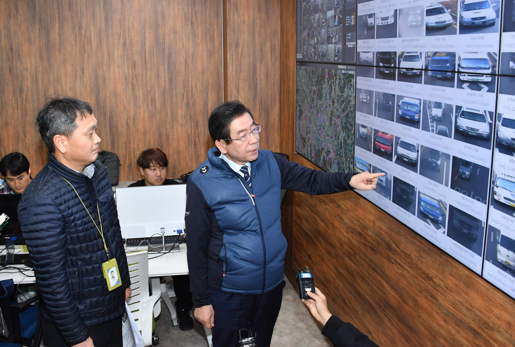 박원순 서울시장이 22일 미세먼지 비상저감조치와 관련해 서울 중구 서울시청 서소문별관에 위치한 차량 운행제한 상황실을 방문해 노후 경유차 단속 상황을 보고 있다. 서울시 제공