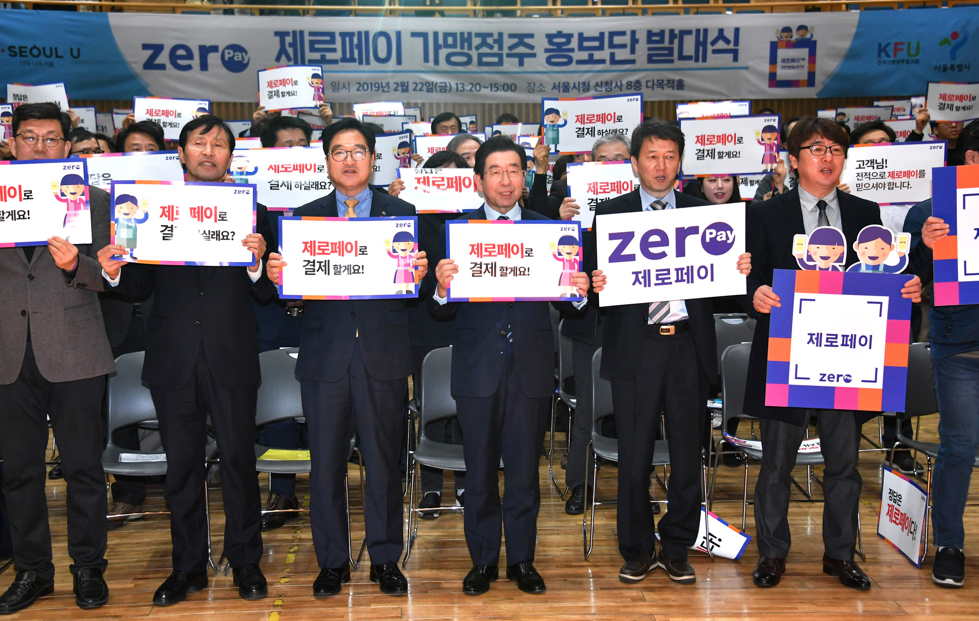 박원순 서울특별시장(왼쪽)이 22일 서울 중구 서울시청 다목적홀에서 진행된 '제로페이 가맹점주 홍보단 발대식'에서 가맹점주들을 대표해 이중희 행복한동행 파리바게뜨 가맹점주협의회장에게 위촉장을 전달하고 있다.서울시 제공