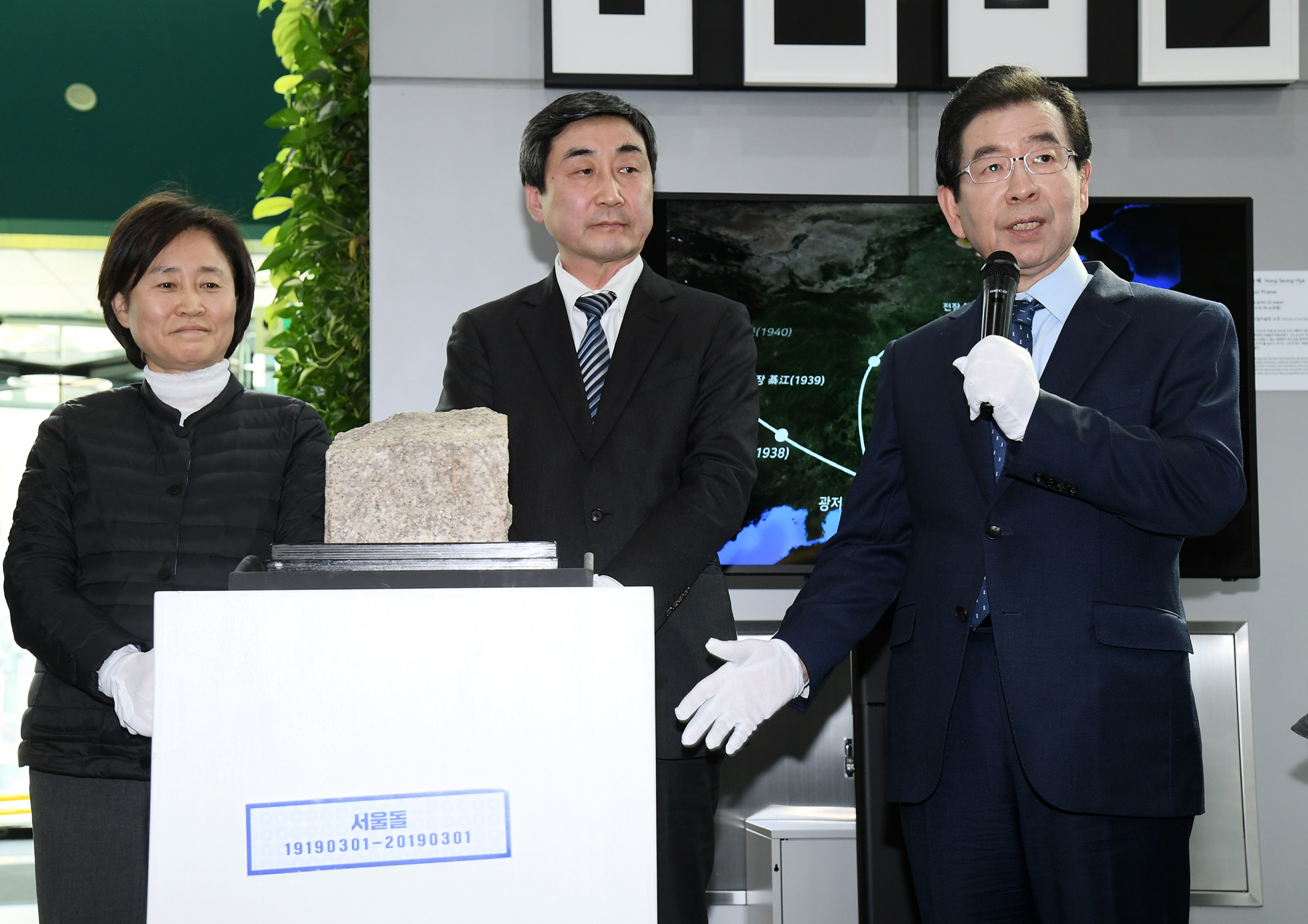 | 사진설명 | 박원순 서울시장(가운데)과 독립운동가 이은숙 선생의 손자인 더불어민주당 이종걸 의원(오른쪽), 윤봉길 의사의 장손 윤주경 선생(왼쪽)이 24일 서울시청 로비에서 열린 '돌의 귀환'행사에서 식민의 아픈 역사를 간직한 '서울 돌'에 손을 올리고 기념 촬영을 하고 있다. 창신동 채석장에서 채굴된 '서울 돌'은 조선총독부 건물에 쓰였던 것으로 식민의 아픈 역사를 극복하고, 3.1 독립운동을 기리기 위해 종로구 인사동 태화관 터에 조성될 '3.1 독립선언 광장'의 주춧돌로 쓰일 예정이다. 서울시 제공 |