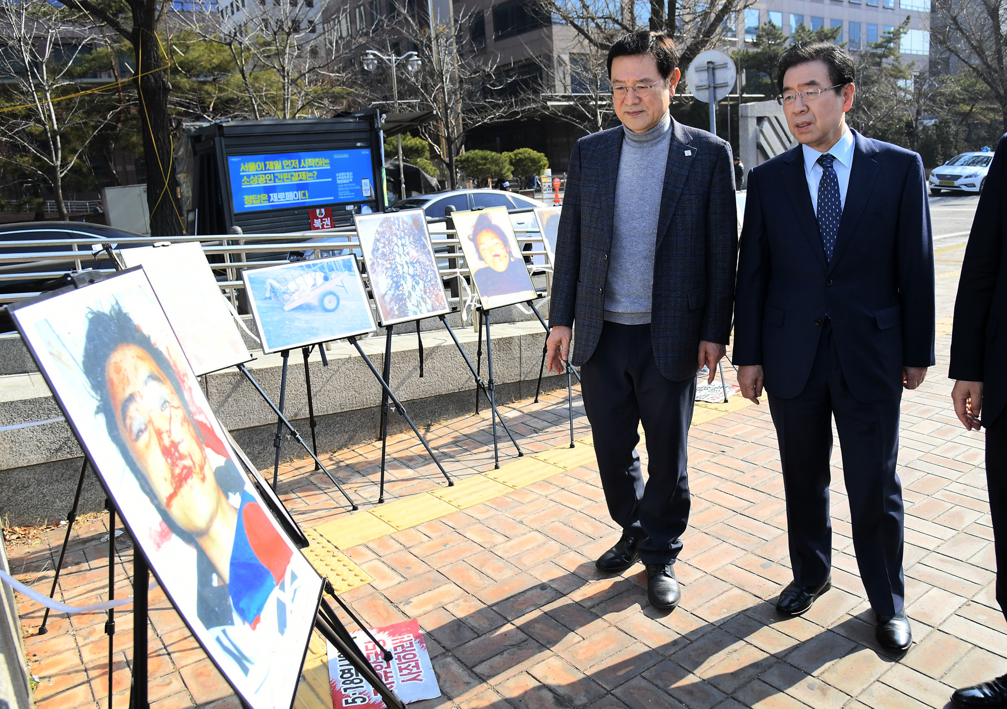 박원순 서울시장을 비롯한 전국 15개 시·도의 광역단체장들이 최근 자유한국당 일부 의원의 5·18 민주화운동 왜곡·폄훼 발언을 규탄했다. 박원순 시장과 이용섭 광주시장 등은 이날 오전 10시 30분 국회 정론관에서 '5.18 민주화운동의 올바른 인식과 가치 실현을 위한 시·도지사 공동입장문'을 발표했다. 입장문에는 전국 17개 시·도지사 중 권영진 대구시장과 이철우 경북지사 등 한국당 소속 2명을 제외한 15명이 이름을 올렸다. 민주당 소속 14명 외에 무소속 원희룡 제주지사가 동참했다. 서울시 제공 |