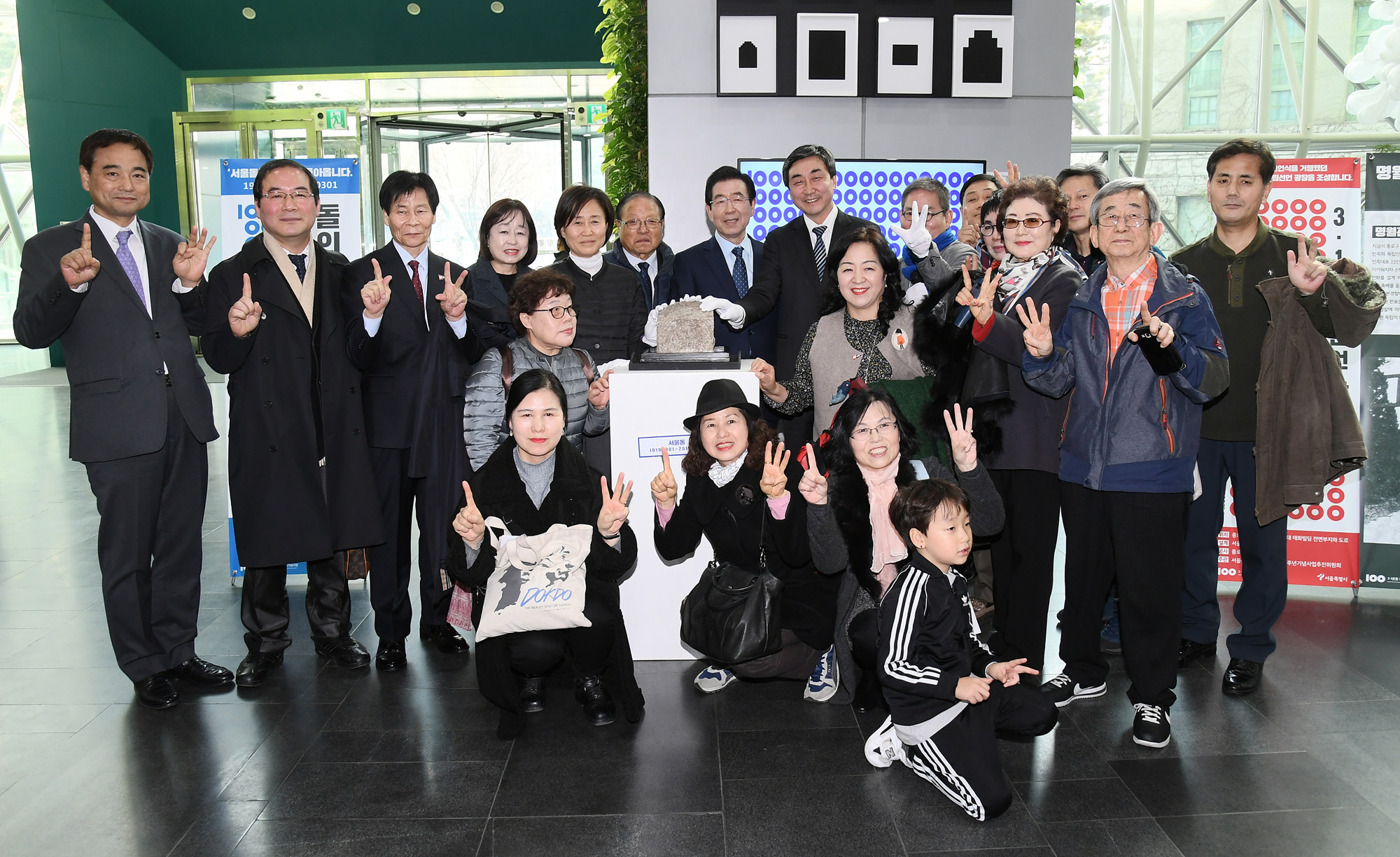 | 사진설명 | 박원순 서울시장(가운데)과 독립운동가 이은숙 선생의 손자인 더불어민주당 이종걸 의원(오른쪽), 윤봉길 의사의 장손 윤주경 선생(왼쪽)이 24일 서울시청 로비에서 열린 '돌의 귀환'행사에서 식민의 아픈 역사를 간직한 '서울 돌'에 손을 올리고 기념 촬영을 하고 있다. 창신동 채석장에서 채굴된 '서울 돌'은 조선총독부 건물에 쓰였던 것으로 식민의 아픈 역사를 극복하고, 3.1 독립운동을 기리기 위해 종로구 인사동 태화관 터에 조성될 '3.1 독립선언 광장'의 주춧돌로 쓰일 예정이다. 서울시 제공 |