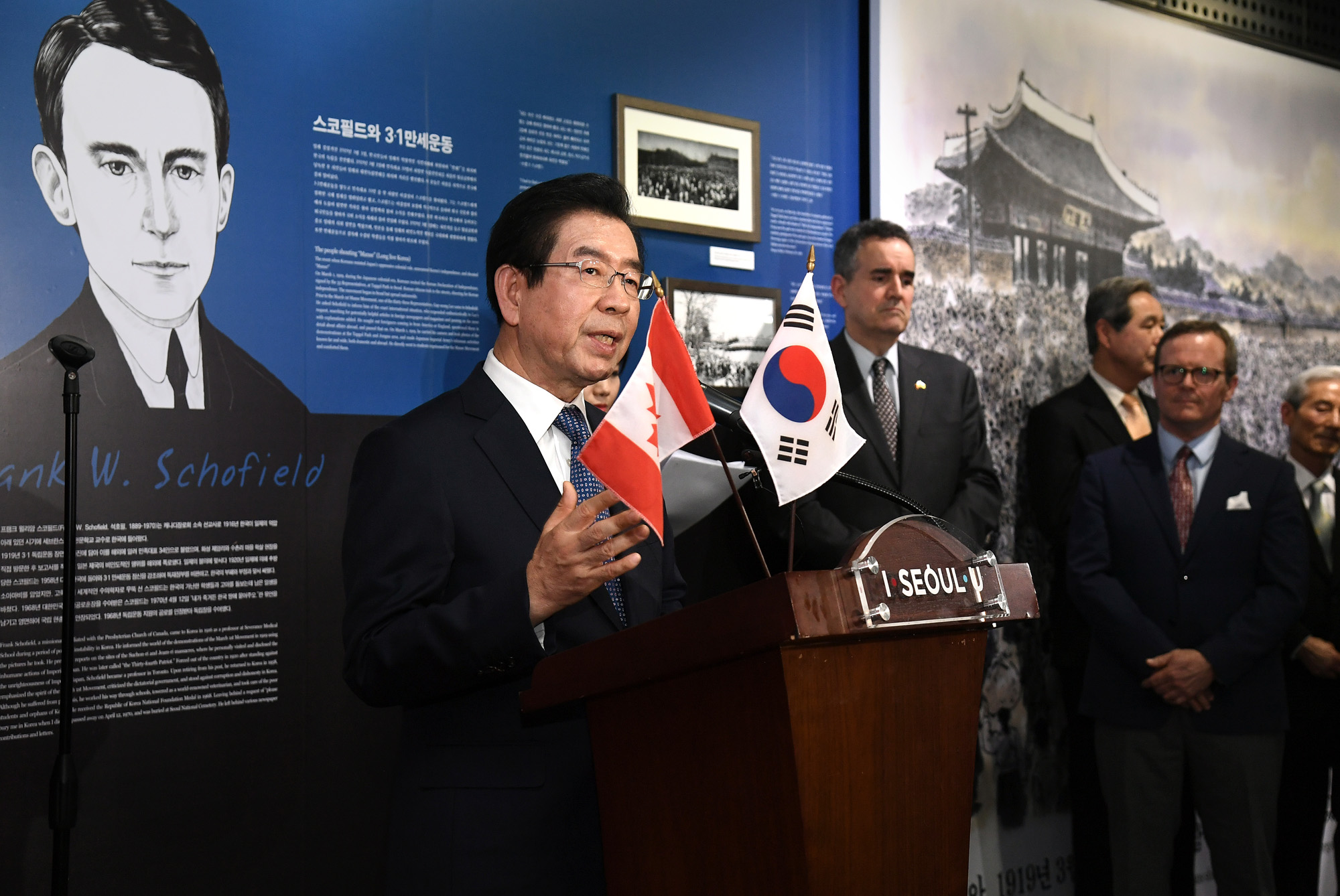 박원순 서울시장이 26일 오후 서울시청 시민청 시민갤러리에서 열린 '3.1운동 100주년 기념 한국의 독립운동과 캐나다인 전시' 개막식에서 참석자들과 손을 맞잡고 있다. 서울시 제공