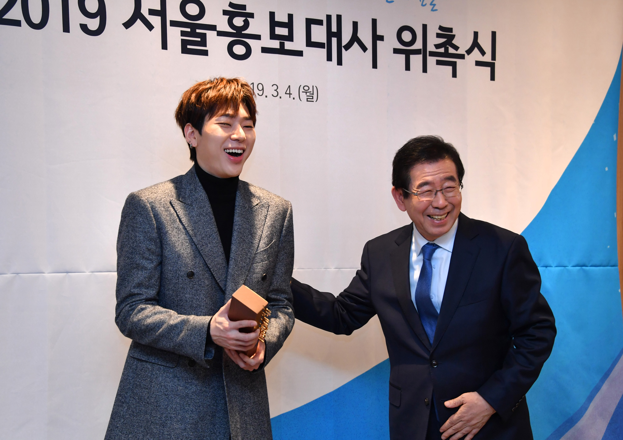 가수 지코와 박원순 서울시장이 4일 오후 서울시청에서 진행된 2019 서울 홍보대사 위촉식에 참석해 기념촬영을 하고 있다. 서울시 제공
