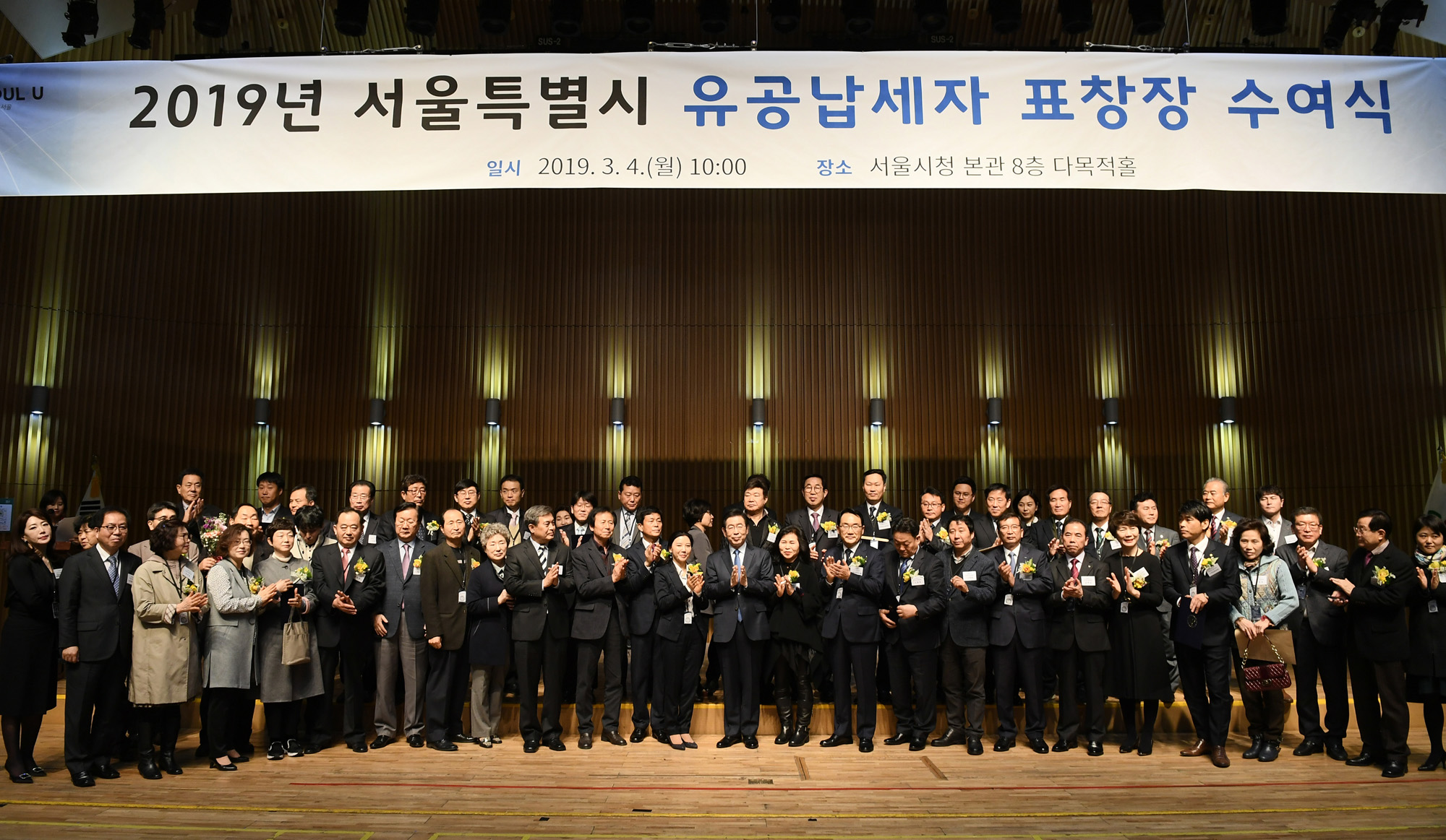 박원순 서울시장이 4일 오전 서울 중구 서울시청 본관에서 열린 '2019년 서울시 유공납세자 표창장 수여식'에서 모범 납세자에게 표창을 수여하고 있다. 서울시 제공