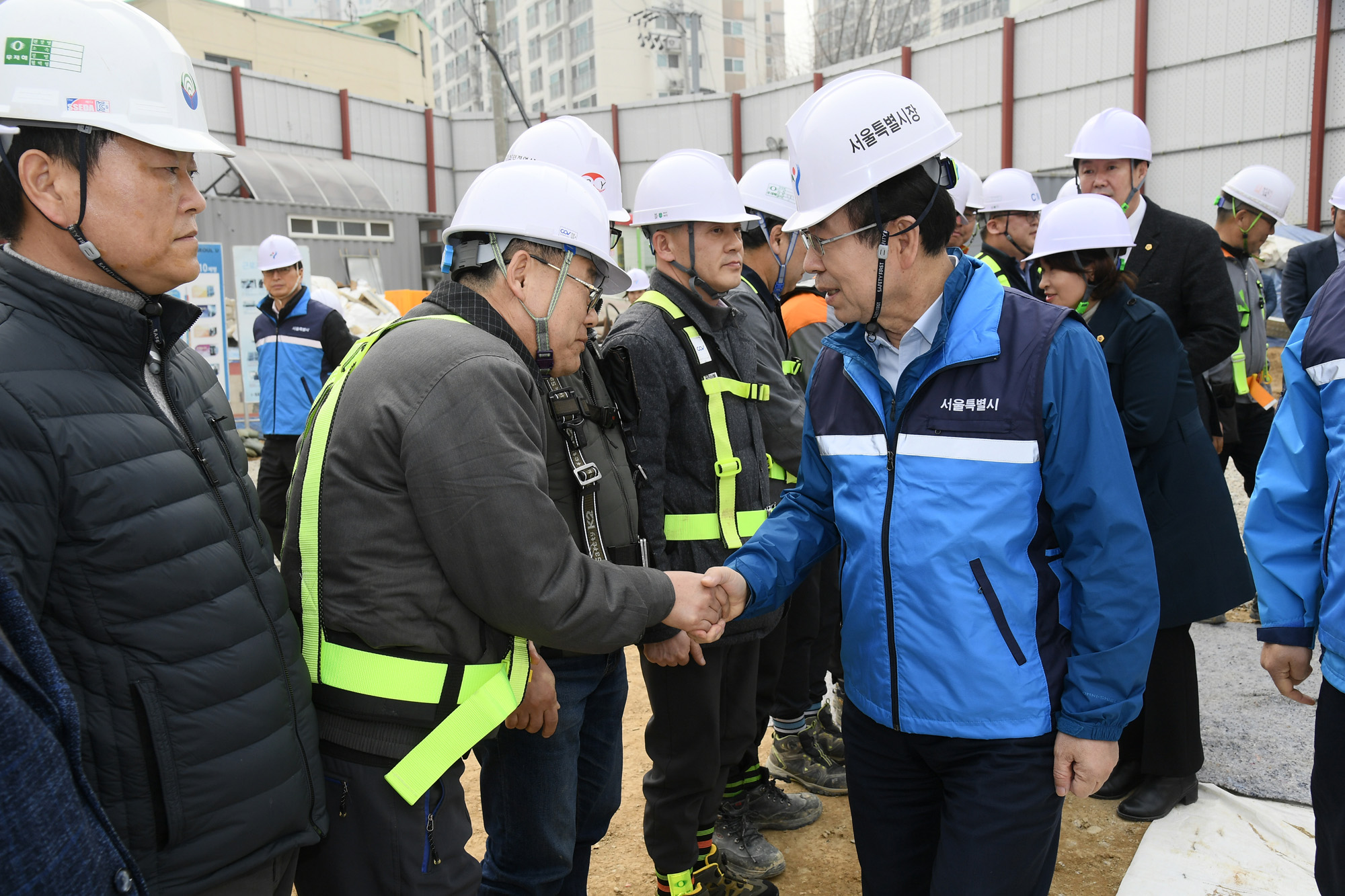 박원순 서울시장이 5일 시민단체 관계자들과 서울 동작구 대방동 여성가족복합시설 '스페이스 살림' 공사현장을 방문해 축대 지지대 안전 점검을 하고 있다. 서울시 제공