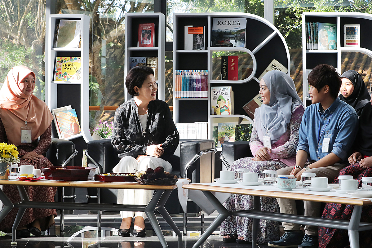 브루나이를 국빈 방문 중인 문재인 대통령의 부인 김정숙 여사가 11일 브루나이 국립대학교를 방문해 한국어 수업을 듣는 학생들과 대화하고 있다.