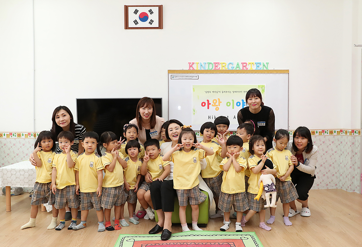 말레이시아를 국빈방문 중인 문재인 대통령 부인 김정숙 여사가 13일 사이버자야에 위치한 한국학교를 방문해 유치원생들에게 동화를 읽어준 뒤 기념촬영하고 있다.