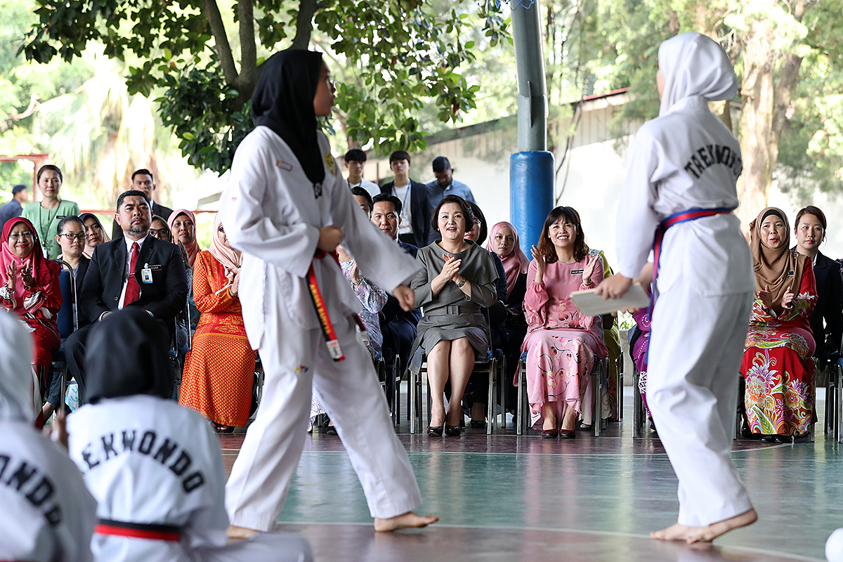 말레이시아를 국빈 방문한 김정숙 여사가 14일 오전(현지시간) 말레이시아 쿠알라룸푸르 스리푸트리 과학중등학교를 방문해 태권도 동아리의 퍼포먼스를 참관하고 있다. 2019.3.14 사진 청와대제공