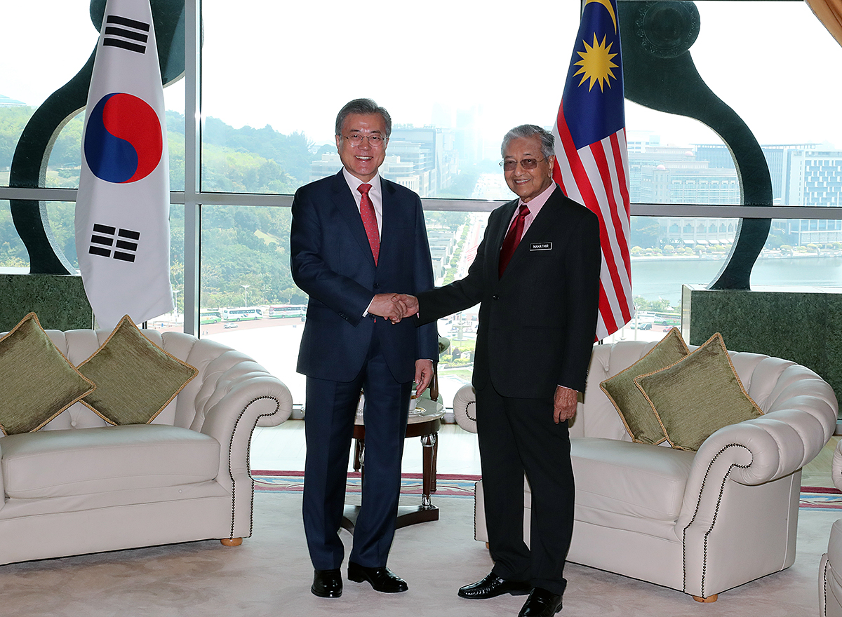 말레이시아를 국빈 방문 중인 문재인 대통령과 마하티르 모하맛 말레이시아 총리가 13일 오후 푸트라자야 총리 궁에서 만나 악수하고 있다.