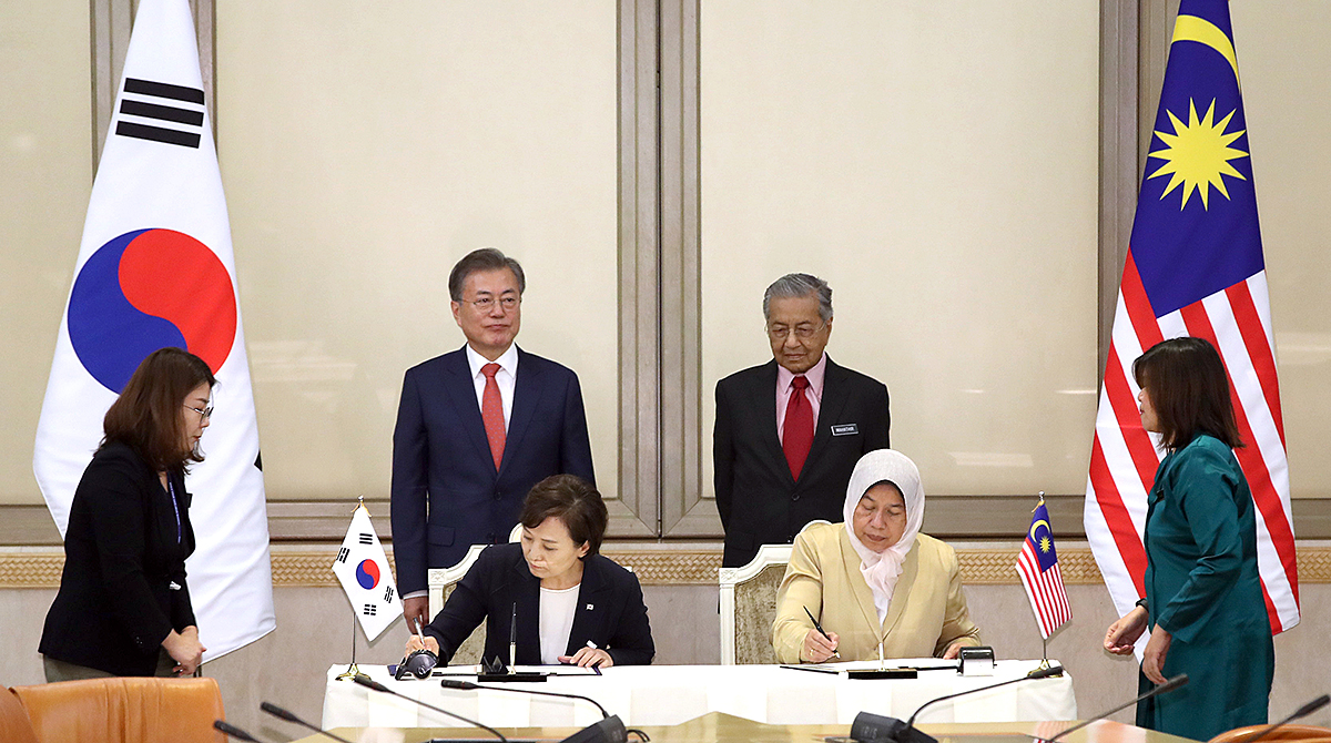김현미 국토교통부 장관과 주라이다 카마루딘(Zuraida Kamaruddin) 말레이시아 주택지방정부부 장관이 13일 푸트라자야 총리실에서 문재인 대통령과 마하티르 모하마드 총리가 지켜보는 가운데 한-말레이시아 스마트시티 양해각서를 체결하고 있다.
