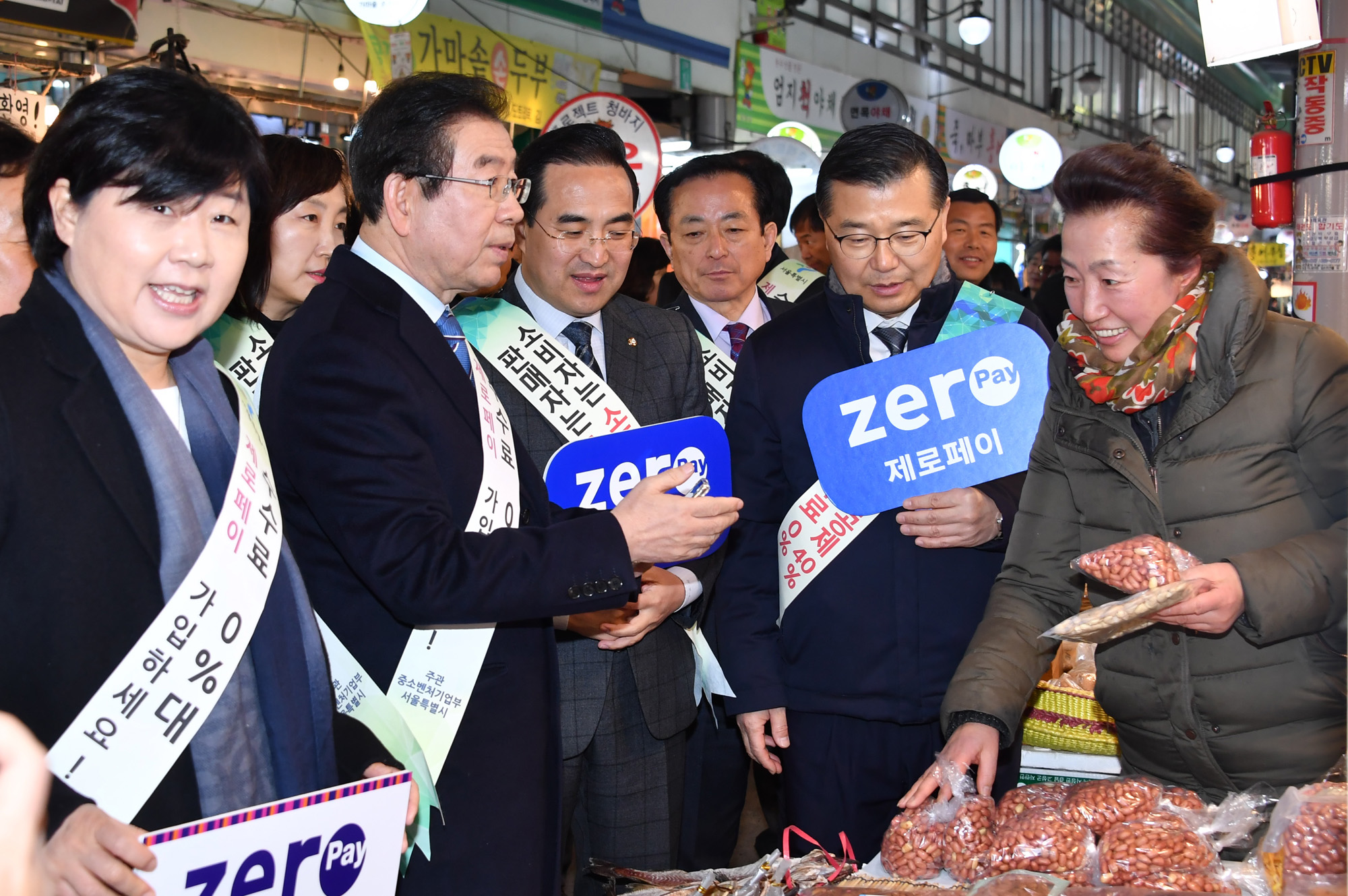 박원순 서울시장이 제로페이 시연 및 가맹을 독려하기 위해 13일 오후 서울 중랑구 우림시장을 찾아 인사말을 하고 있다. 서울시 제공