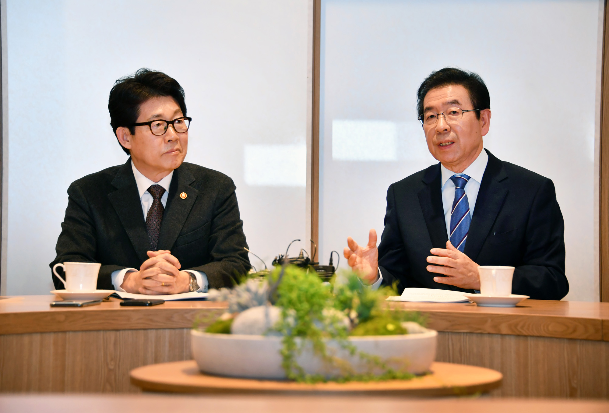 조명래 환경부 장관과 박원순 서울시장이 13일 오후 서울시청 시장집무실에서 열린 환경부와 수도권 3개 시·도의 고농도 미세먼지 대응 강화 방안 논의에 앞서 인사를 나누고 있다. 서울시 제공