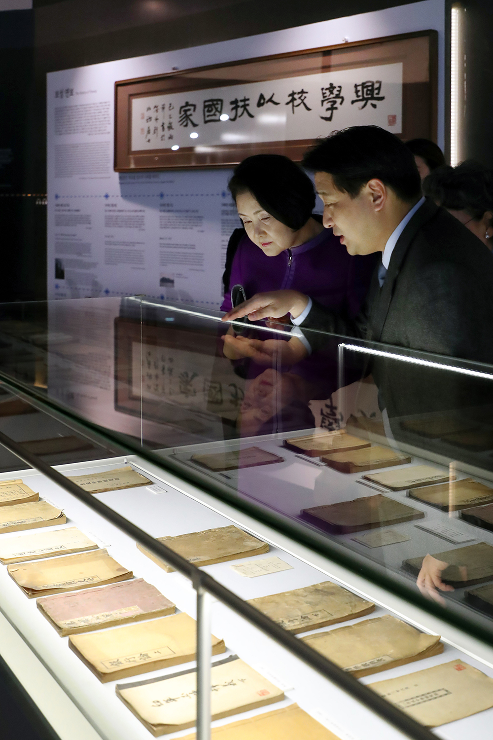 김정숙 여사가 21일 오후 서울 동대문디자인플라자(DDP) 디자인박물관에서 열린 3.1운동 100주년 간송특별전 ‘대한콜랙숀’ 전시를 찾아 간송 전형필 선생의 손자 전인건 간송미술관장으로부터 설명을 듣고 있다. 2019.3.21 사진 청와대제공